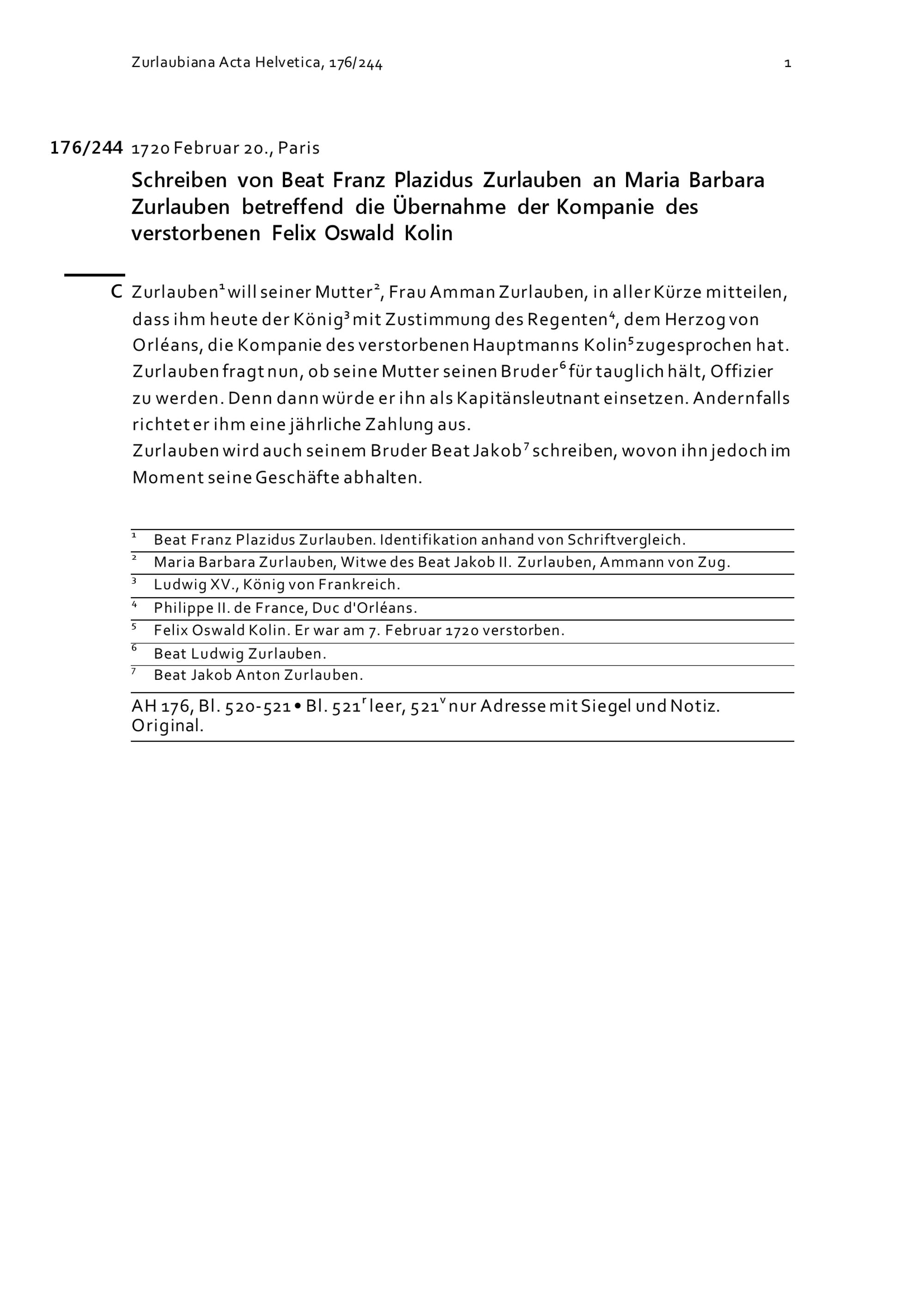 Schreiben von Beat Franz Plazidus Zurlauben an Maria Barbara Zurlauben betreffend die Übernahme der Kompanie des verstorbenen Felix Oswald Kolin
