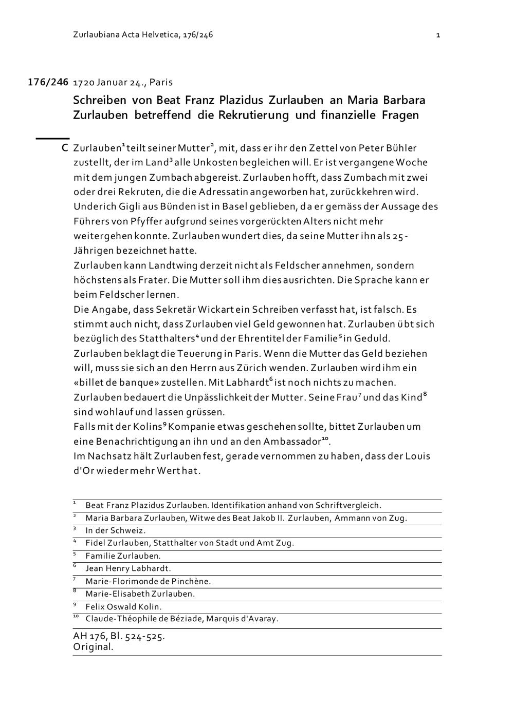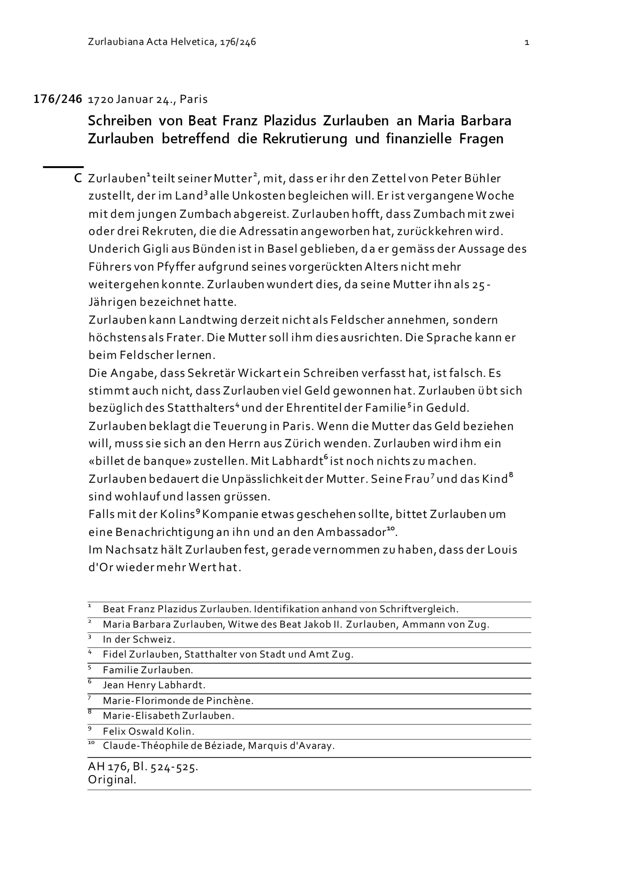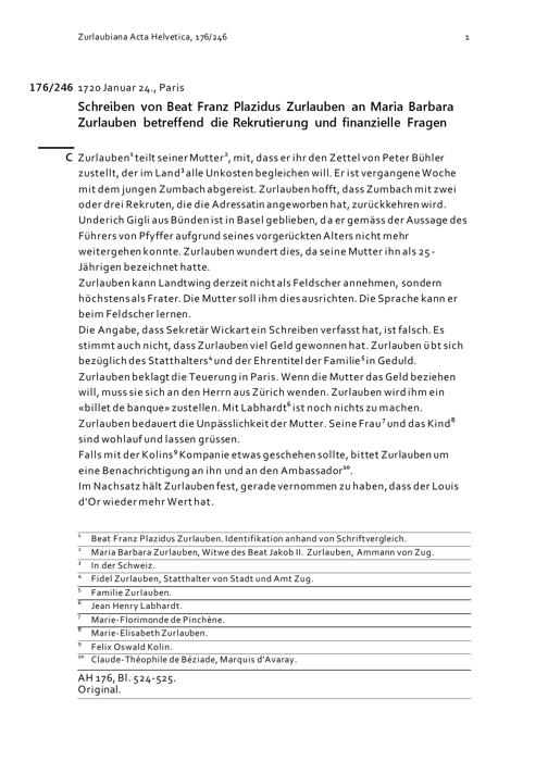 Schreiben von Beat Franz Plazidus Zurlauben an Maria Barbara Zurlauben betreffend die Rekrutierung und finanzielle Fragen
