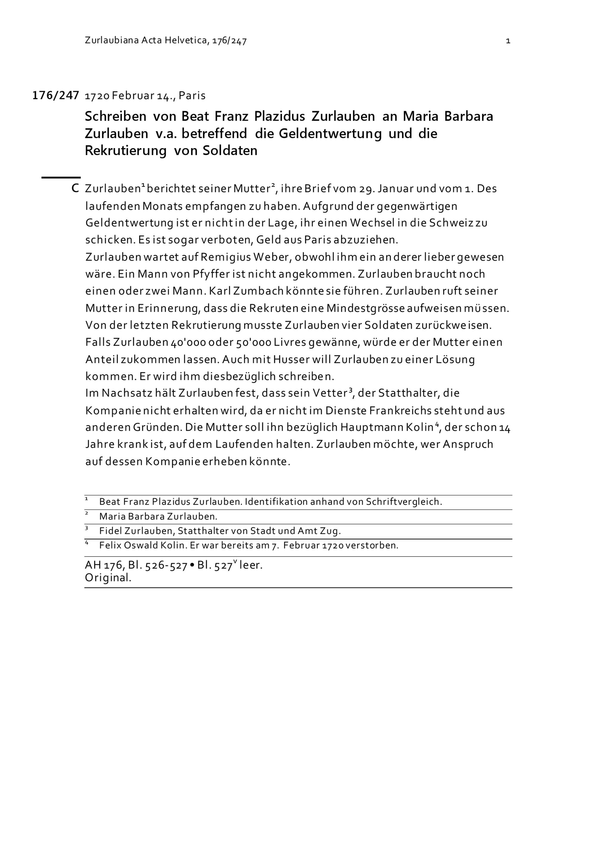 Schreiben von Beat Franz Plazidus Zurlauben an Maria Barbara Zurlauben v.a. betreffend die Geldentwertung und die Rekrutierung von Soldaten