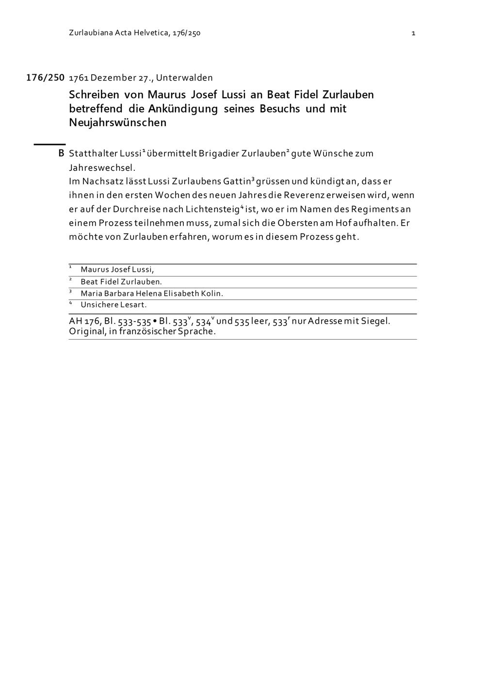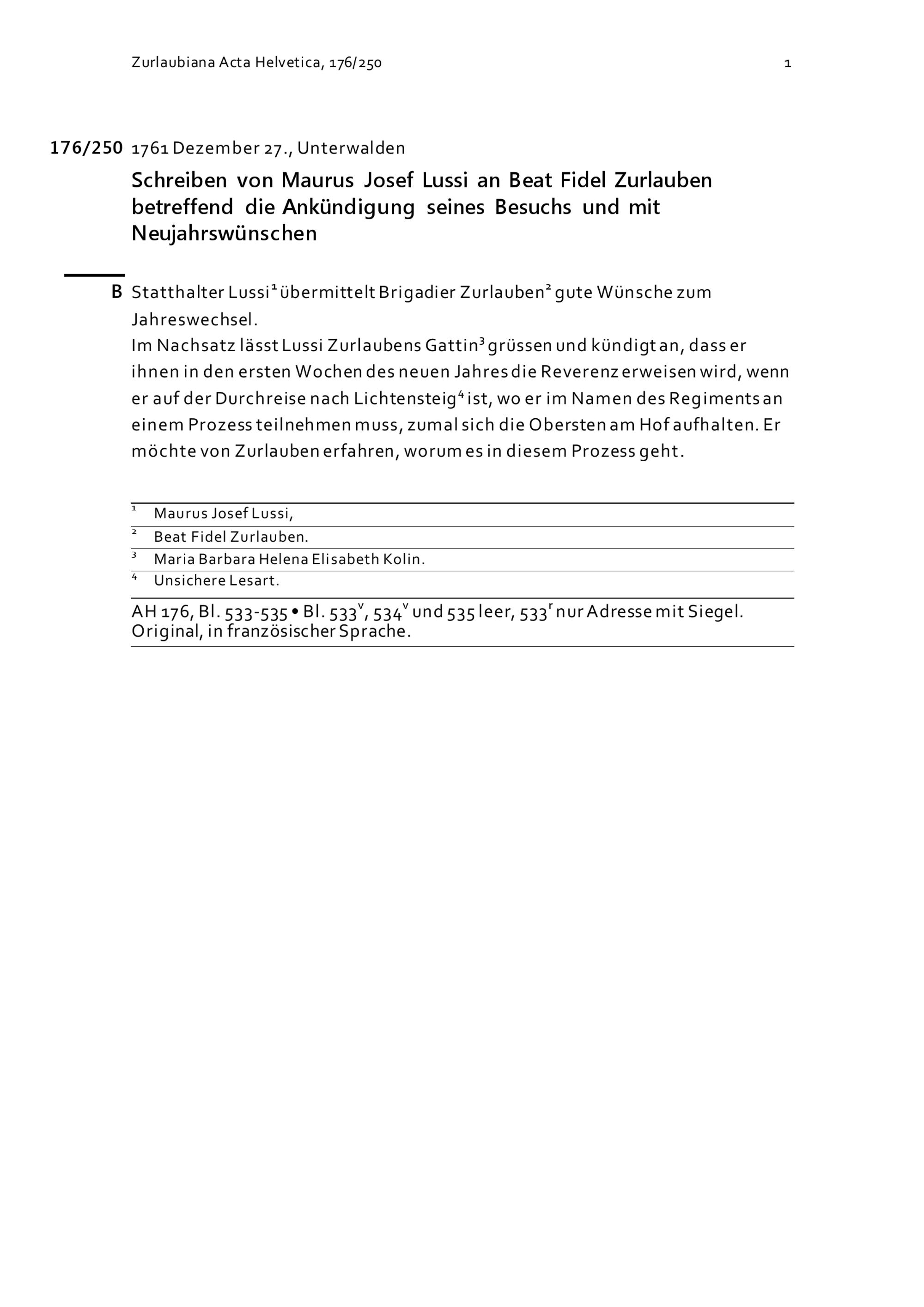 Schreiben von Maurus Josef Lussi an Beat Fidel Zurlauben betreffend die Ankündigung...