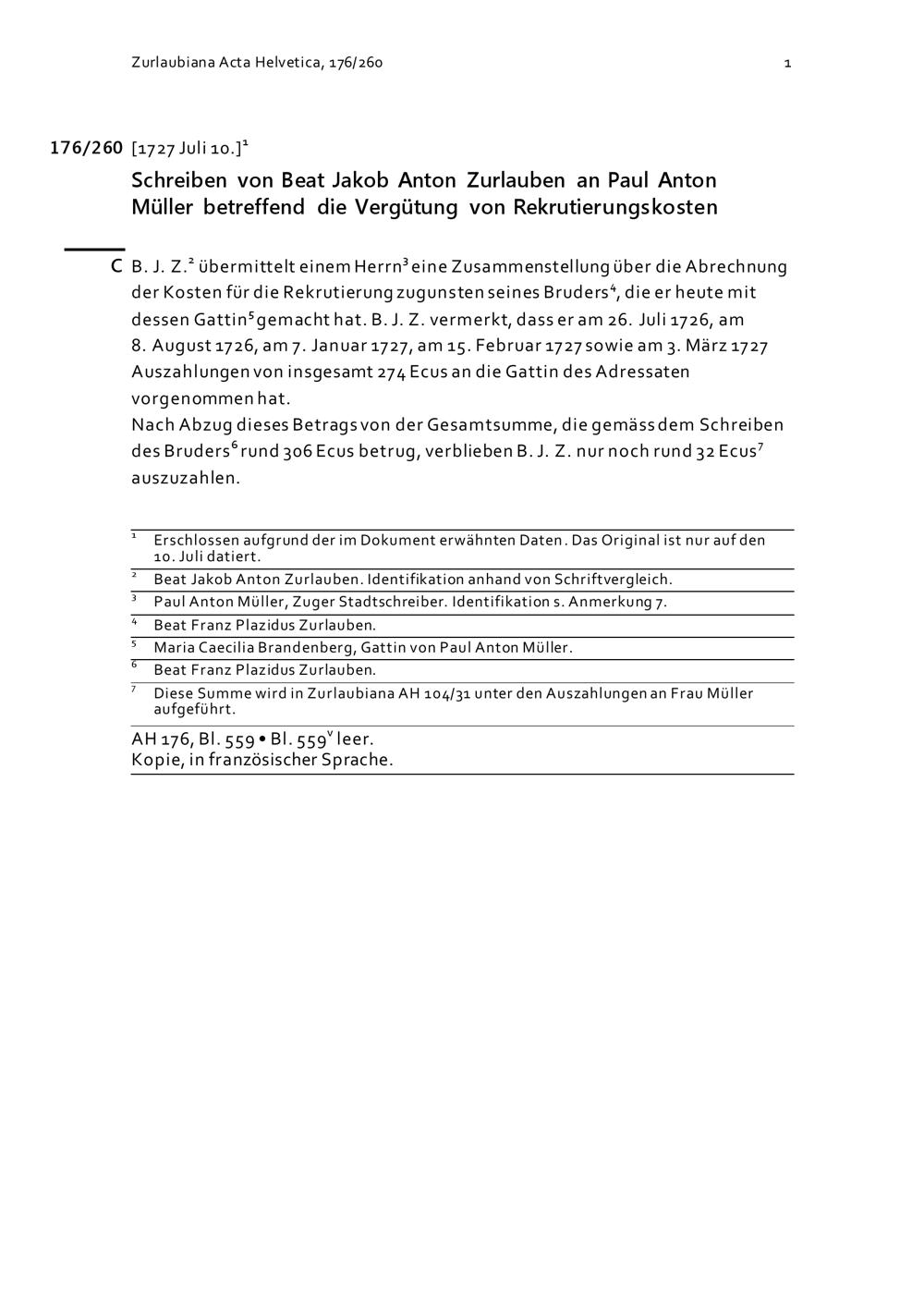 Schreiben von Beat Jakob Anton Zurlauben an Paul Anton Müller betreffend die Vergütung von Rekrutierungskosten