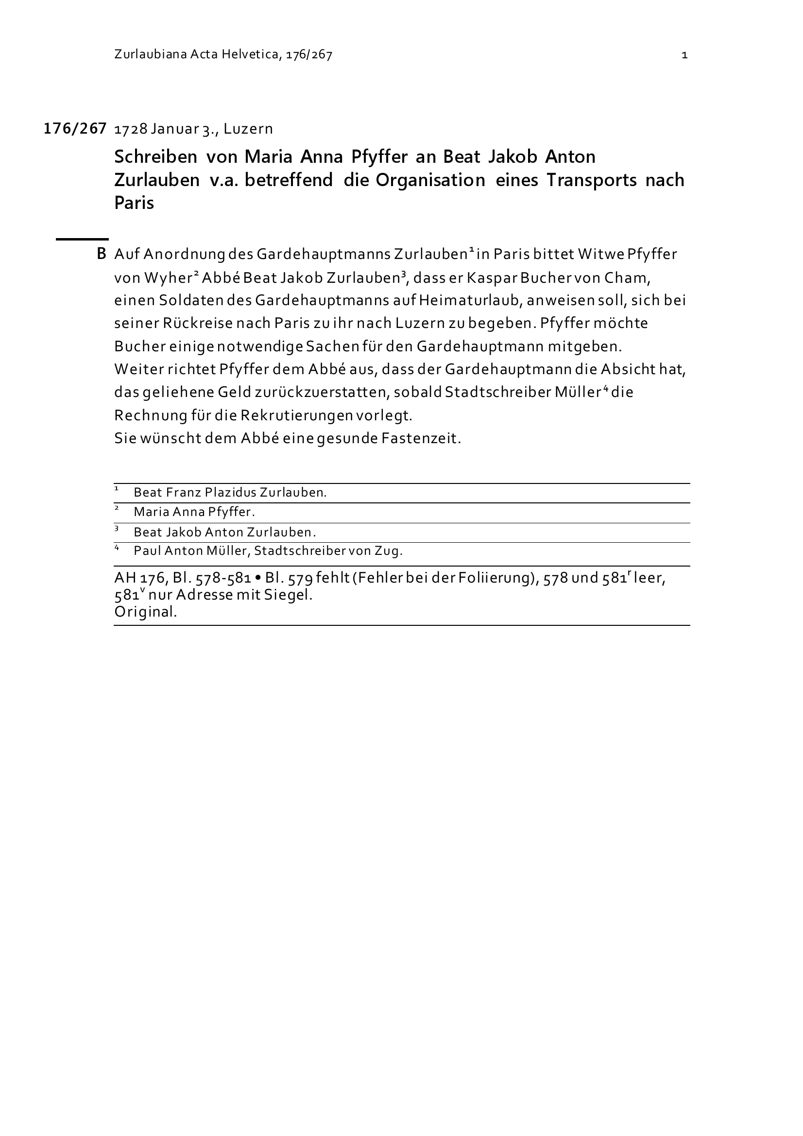 Schreiben von Maria Anna Pfyffer an Beat Jakob Anton Zurlauben v.a. betreffend die Organisation eines Transports nach Paris