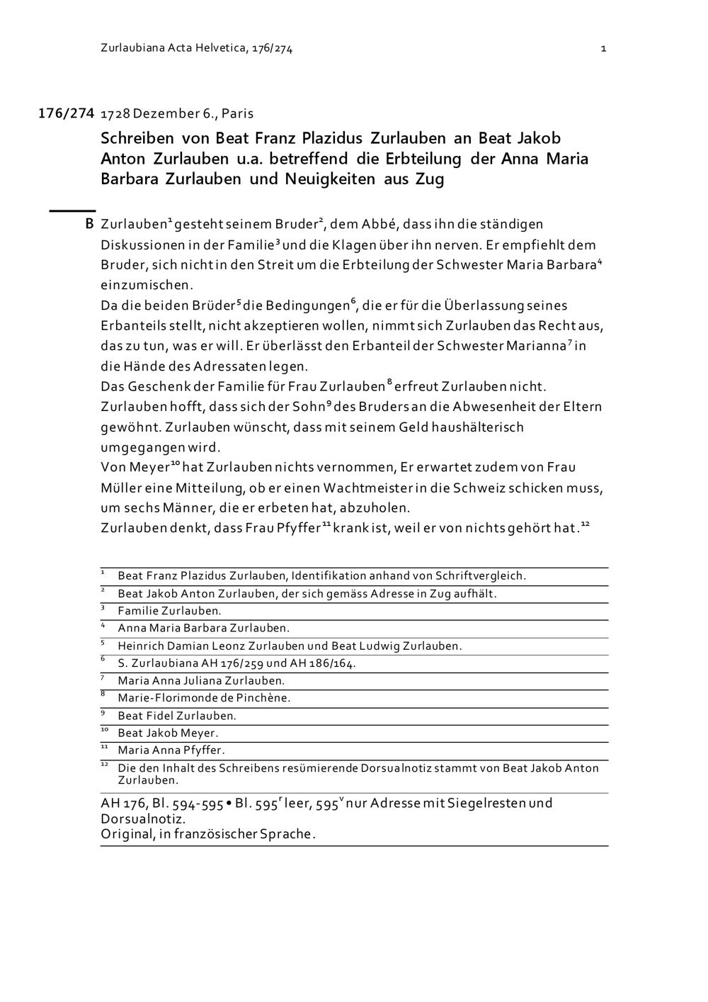 Schreiben von Beat Franz Plazidus Zurlauben an Beat Jakob Anton Zurlauben u.a. betreffend die Erbteilung der Anna Maria Barbara Zurlauben und Neuigkeiten aus Zug