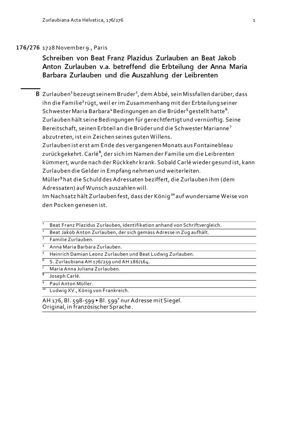Schreiben von Beat Franz Plazidus Zurlauben an Beat Jakob Anton Zurlauben v.a. betreffend die Erbteilung der Anna Maria Barbara Zurlauben und die Auszahlung der Leibrenten