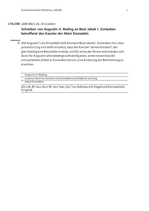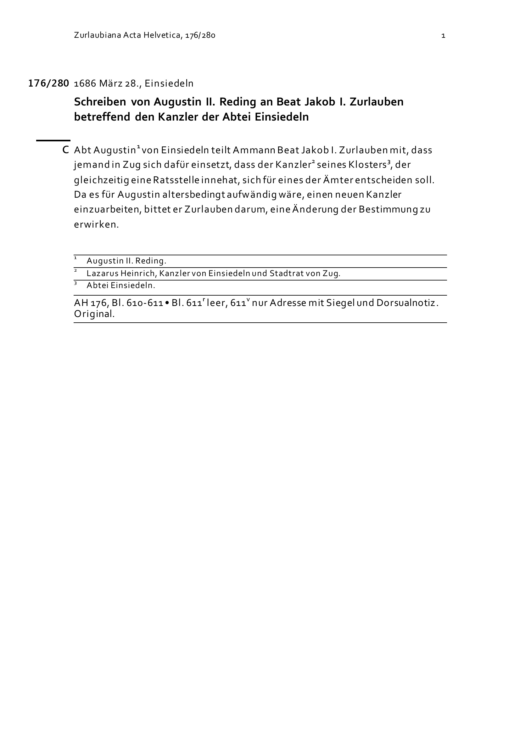 Schreiben von Augustin II. Reding an Beat Jakob I. Zurlauben betreffend den Kanzler der Abtei Einsiedeln