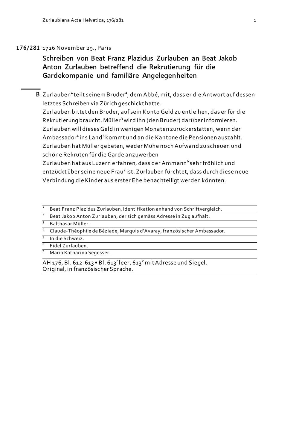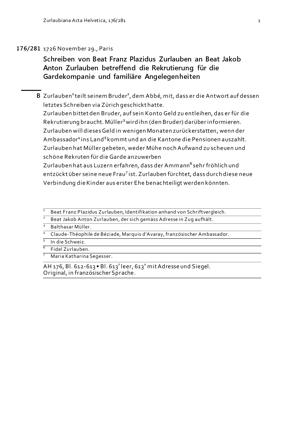Schreiben von Beat Franz Plazidus Zurlauben an Beat Jakob Anton Zurlauben betreffend die Rekrutierung für die Gardekompanie und familiäre Angelegenheiten