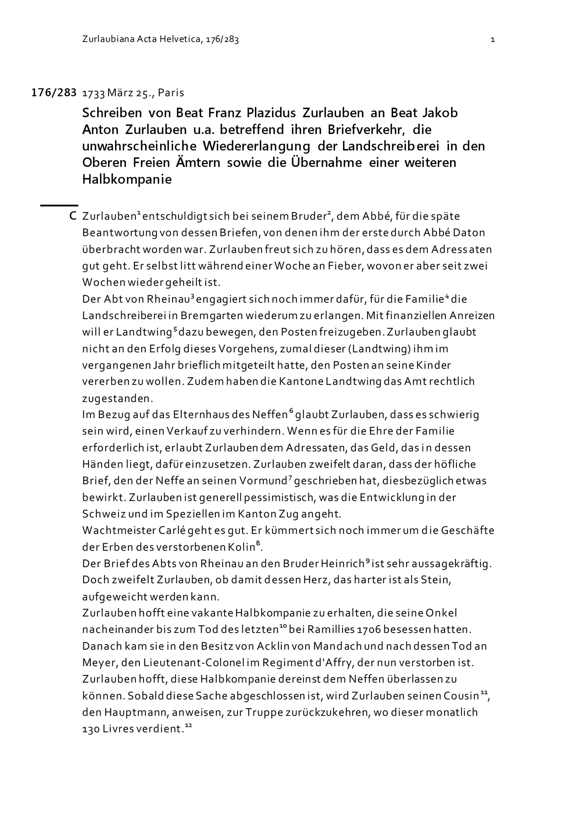 Schreiben von Beat Franz Plazidus Zurlauben an Beat Jakob Anton Zurlauben u.a. betreffend ihren Briefverkehr, die unwahrscheinliche Wiedererlangung der Landschreiberei in den Oberen Freien Ämter sowie die Übernahme einer weiteren Halbkompanie