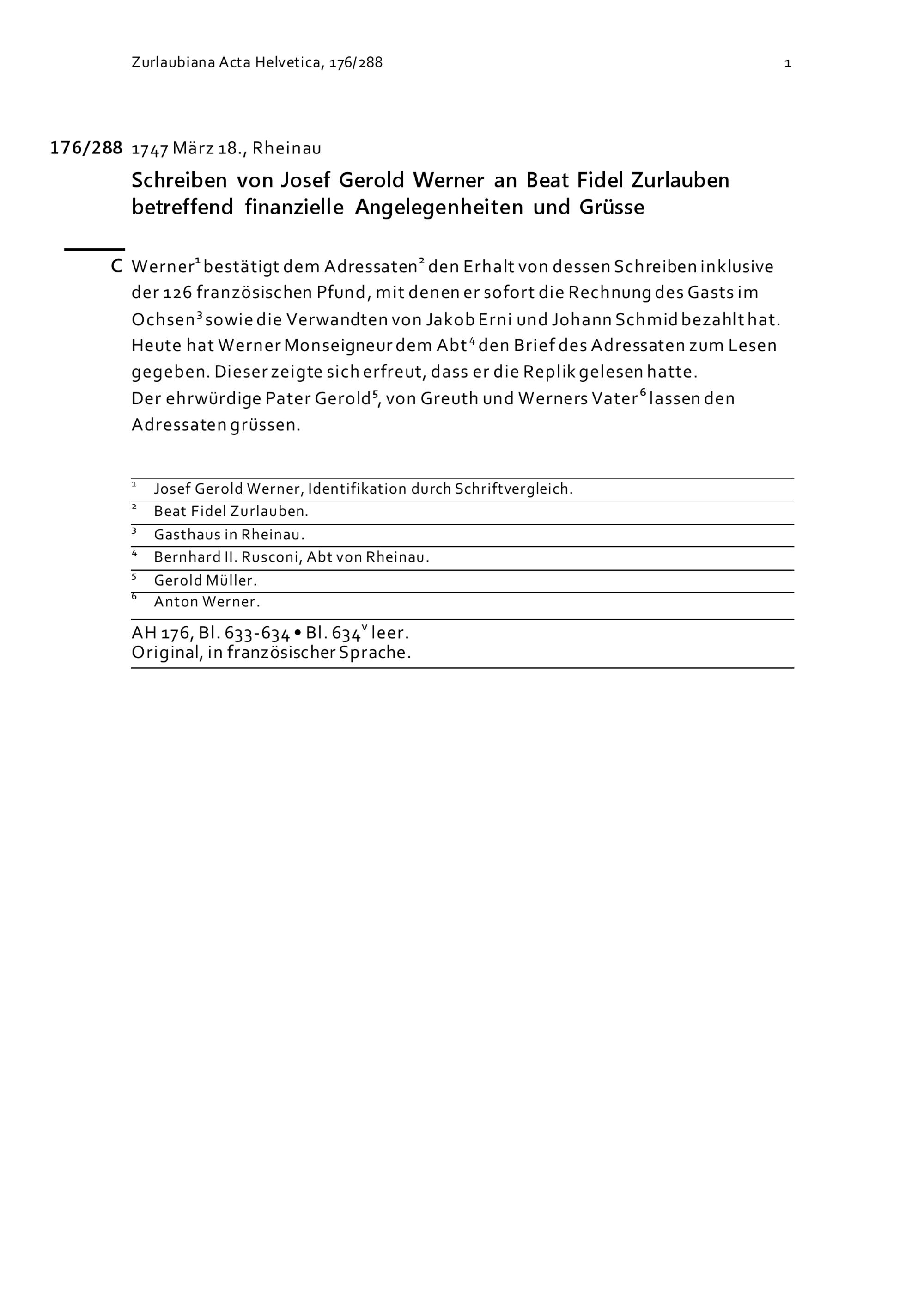 Schreiben von Josef Gerold Werner an Beat Fidel Zurlauben betreffend finanzielle...