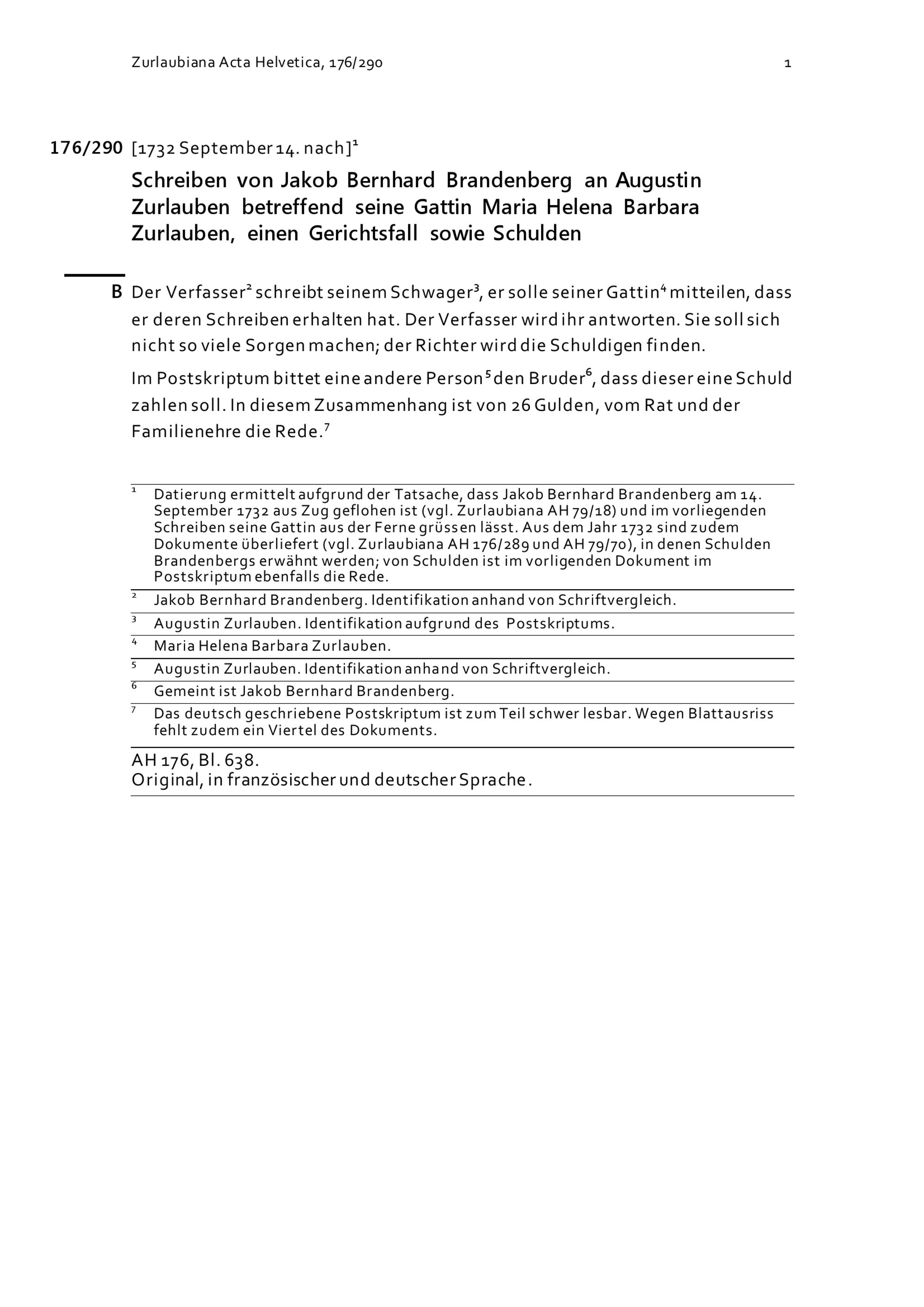 Schreiben von Jakob Bernhard Brandenberg an Augustin Zurlauben betreffend seine Gattin...