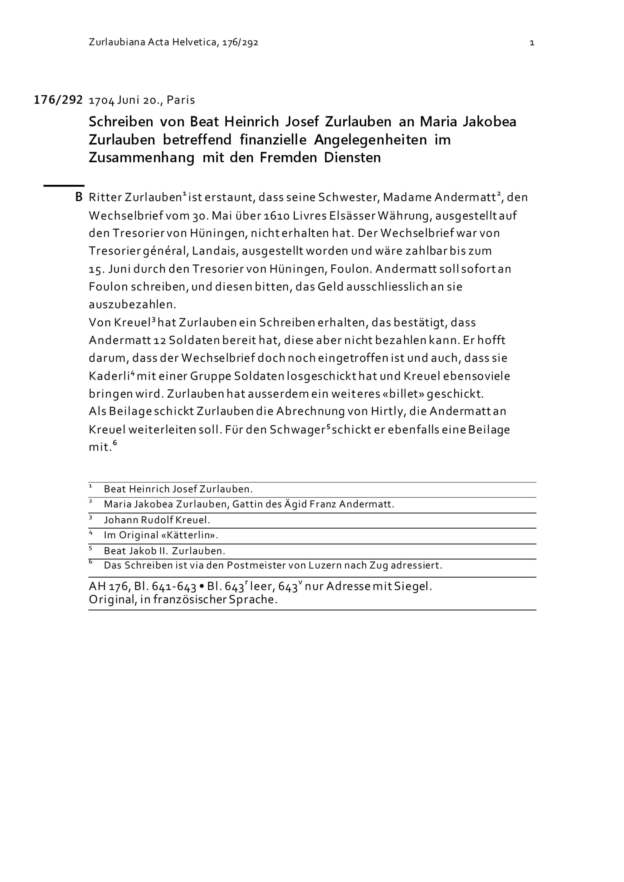 Schreiben von Beat Heinrich Josef Zurlauben an Maria Jakobea Zurlauben betreffend finanzielle Angelegenheiten in Zusammenhang mit den Fremden Diensten
