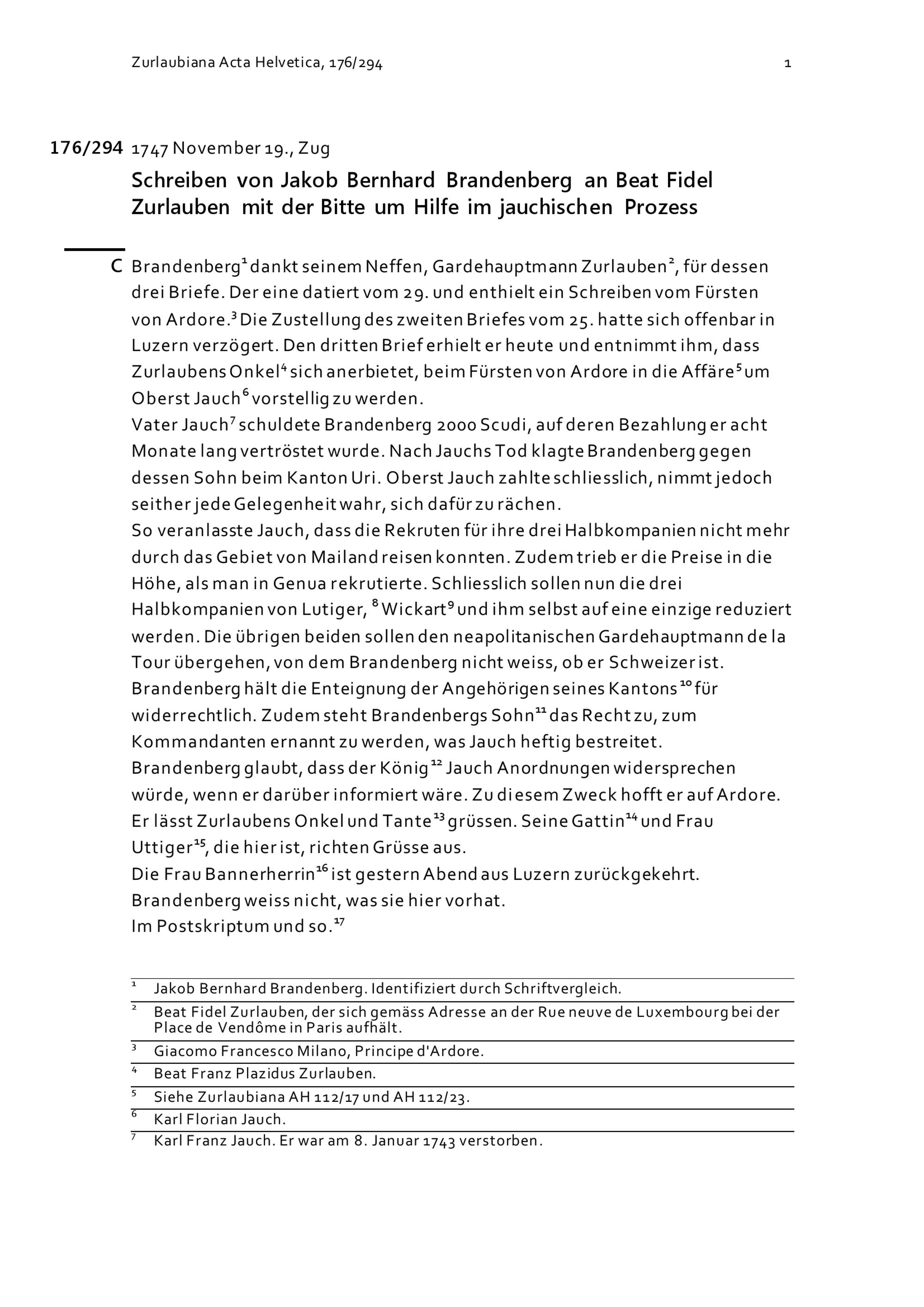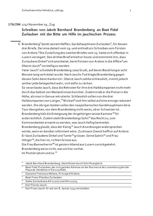 Schreiben von Jakob Bernhard Brandenberg an Beat Fidel Zurlauben mit der Bitte um Hilfe im jauchschen Prozess