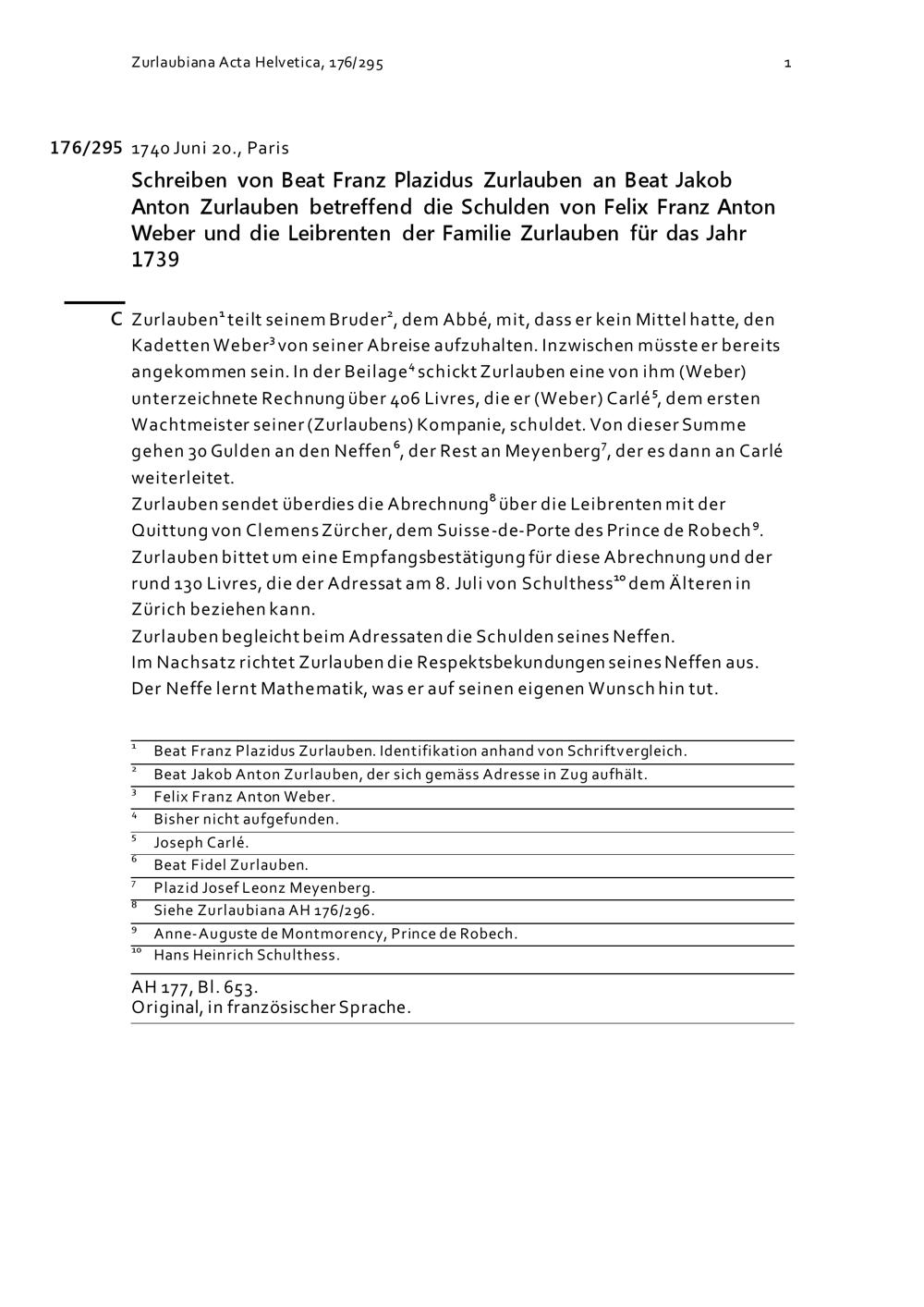 Schreiben von Beat Franz Plazidus Zurlauben an Beat Jakob Anton Zurlauben betreffend die Schulden von Felix Franz Anton Weber und die Leibrenten der Familie Zurlauben für das Jahr 1739