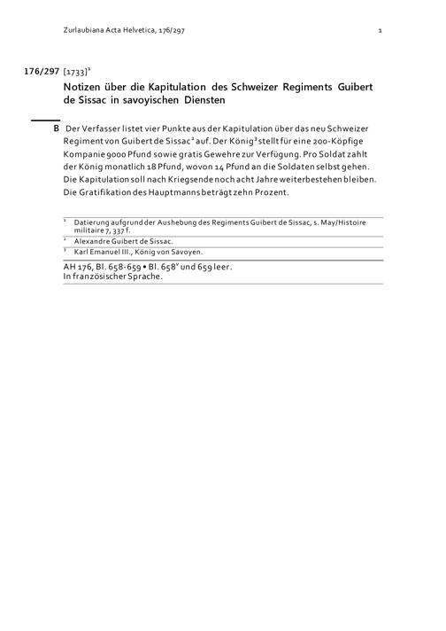 Notiz über die Kapitulation des Schweizer Regiments Guibert de Sissac in savoyischen Diensten