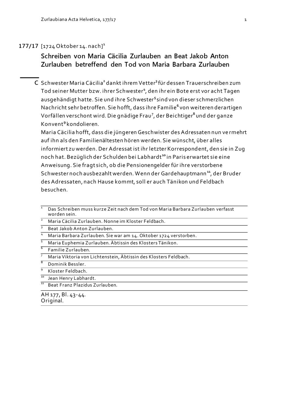 Schreiben von Maria Cäcilia Zurlauben an Beat Jakob Anton Zurlauben betreffend den Tod von Maria Barbara Zurlauben