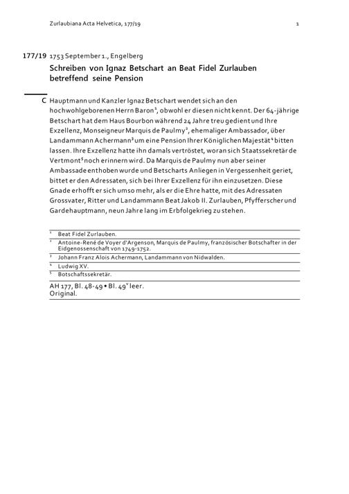 Schreiben von Ignaz Betschart an Beat Fidel Zurlauben betreffend seine Pension