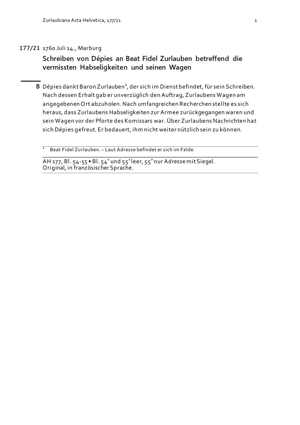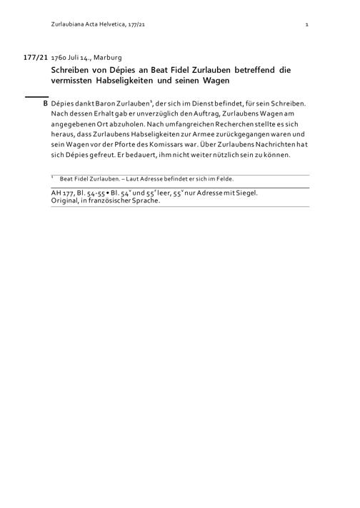 Schreiben von Dépies an Beat Fidel Zurlauben betreffend die vermissten Habseligkeiten...