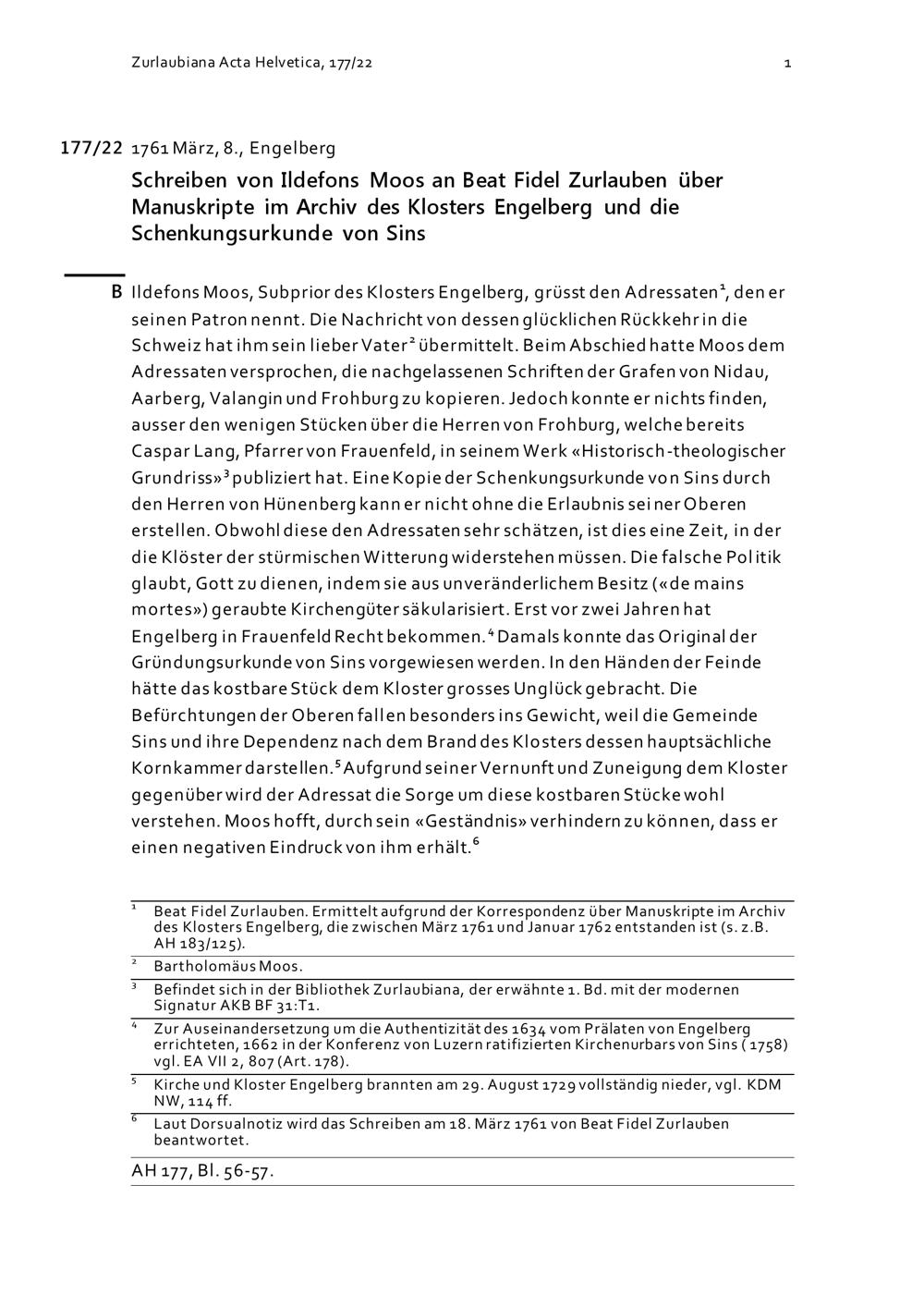 Schreiben von Ildefons Moos an Beat Fidel Zurlauben über Manuskripte im Archiv des Klosters Engelberg und die Schenkungsurkunde von Sins