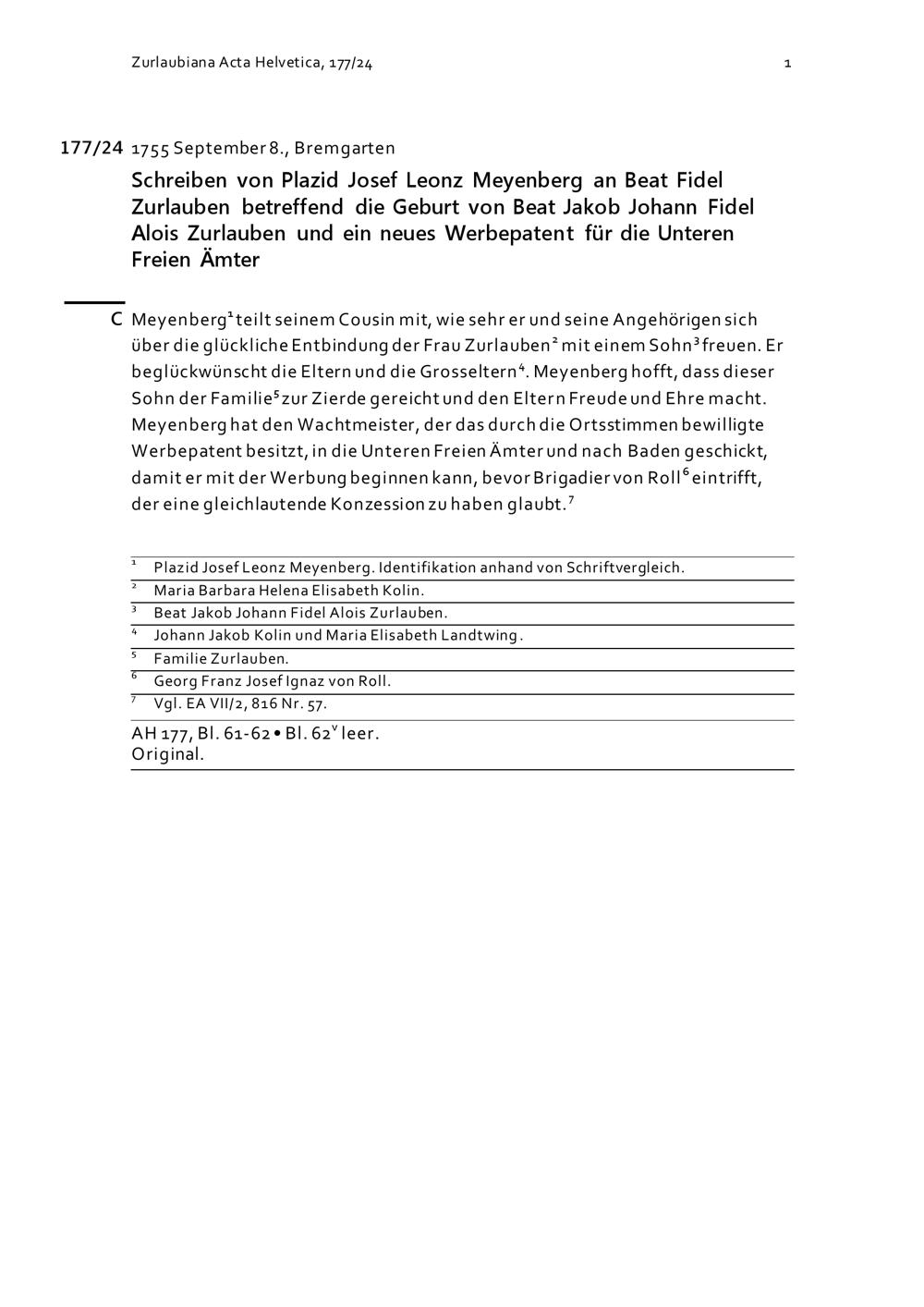 Schreiben von Plazid Josef Leonz Meyenberg an Beat Fidel Zurlauben betreffend die Geburt von Beat Jakob Johann Fidel Alois Zurlauben und ein neues Werbepatent für die Unteren Freien Ämter