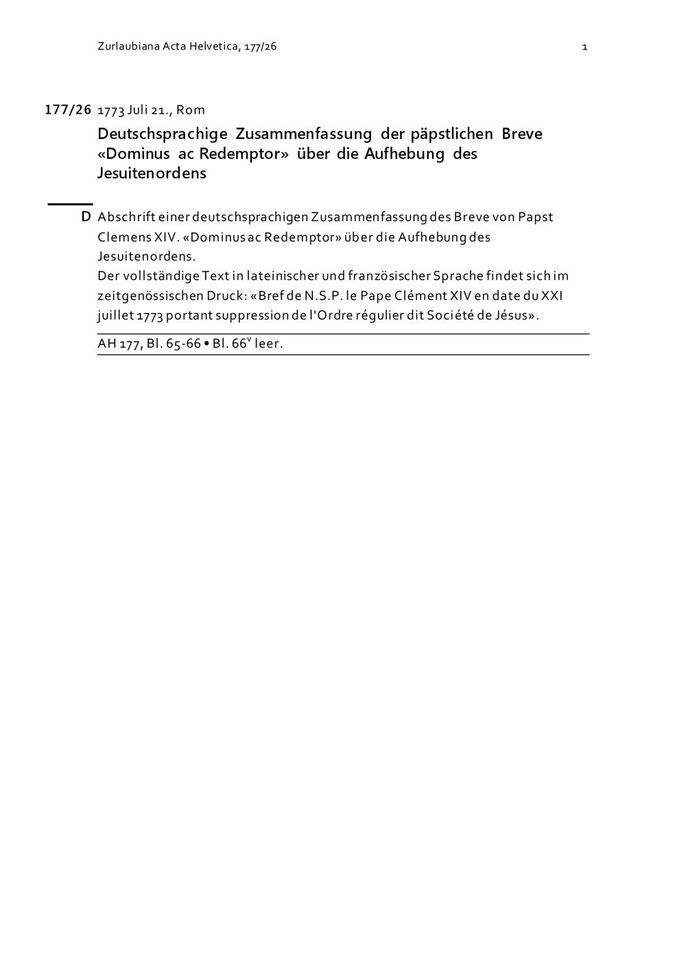 Deutschsprachige Zusammenfassung der päpstlichen Breve «Dominus ac Redemptor» über die Aufhebung des Jesuitenordens