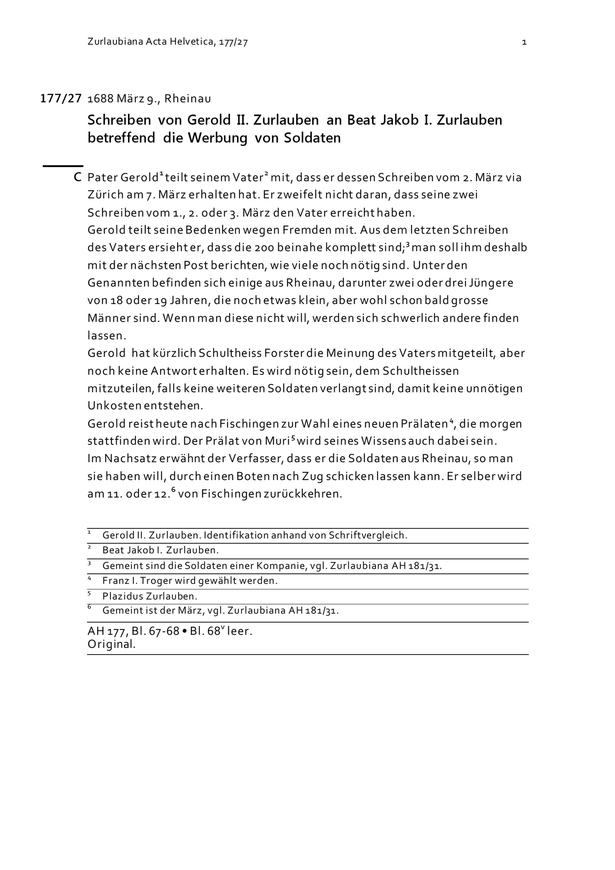 Schreiben von Gerold II. Zurlauben an Beat Jakob I. Zurlauben betreffend die Werbung von Soldaten