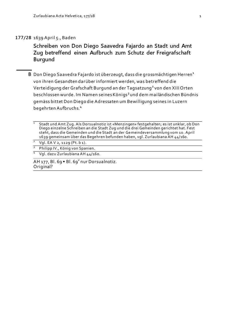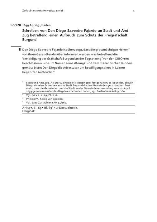 Schreiben von Don Diego Saavedra Fajardo an Stadt und Amt Zug betreffend einen Aufbruch zum Schutz der Freigrafschaft Burgund
