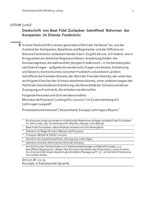 Denkschrift von Beat Fidel Zurlauben betreffend Reformen der Kompanien im Dienste Frankreichs