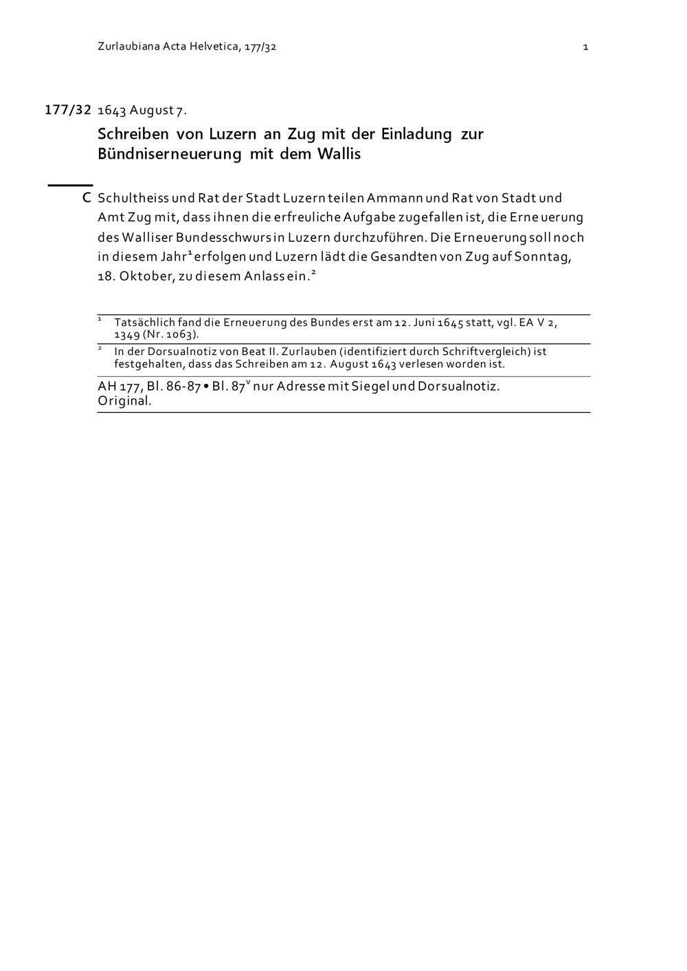 Schreiben von Luzern an Zug mit der Einladung zur Bündniserneuerung mit dem Wallis