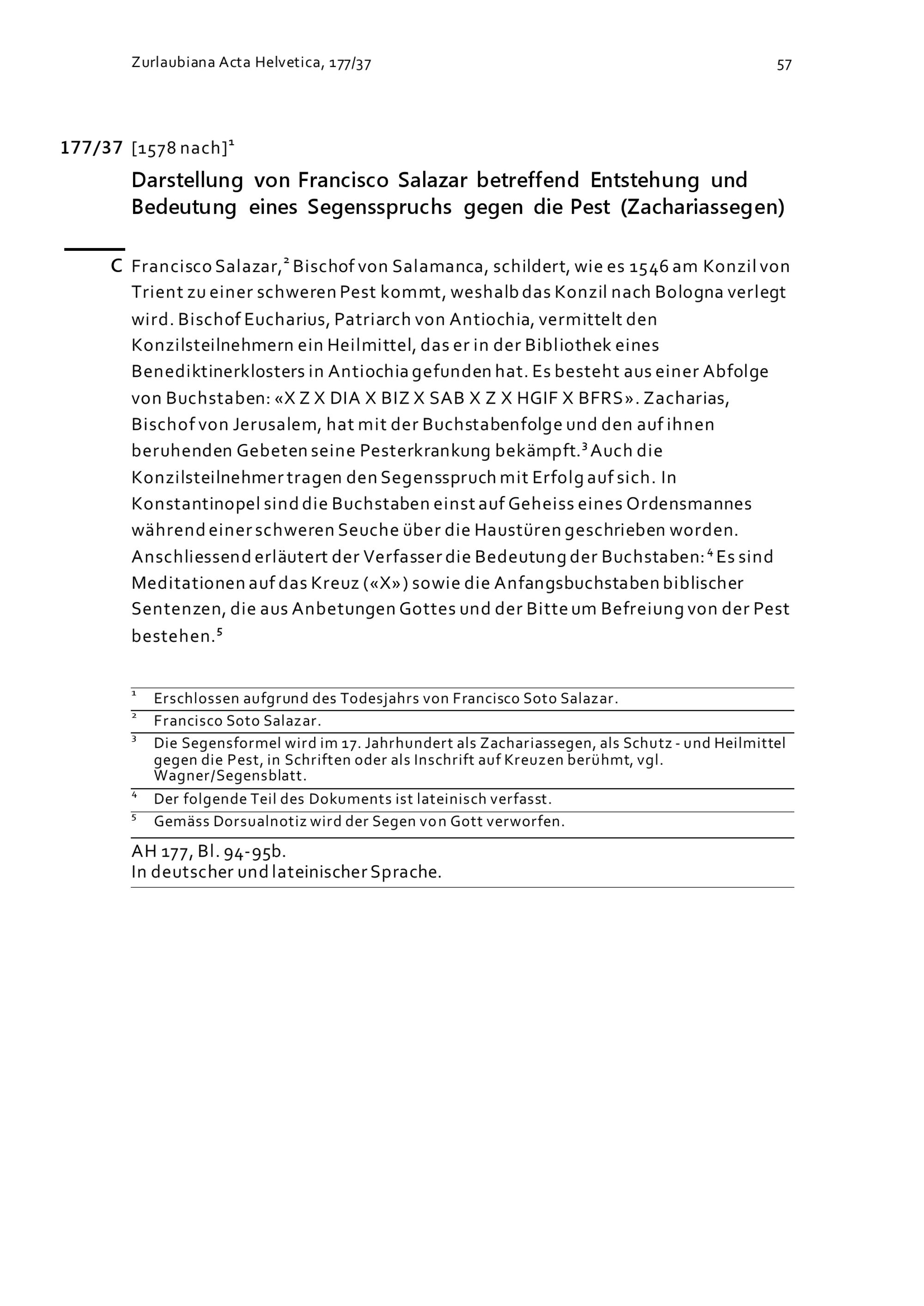 Darstellung von Francisco Salazar betreffend Entstehung und Bedeutung eines Segensspruchs gegen die Pest