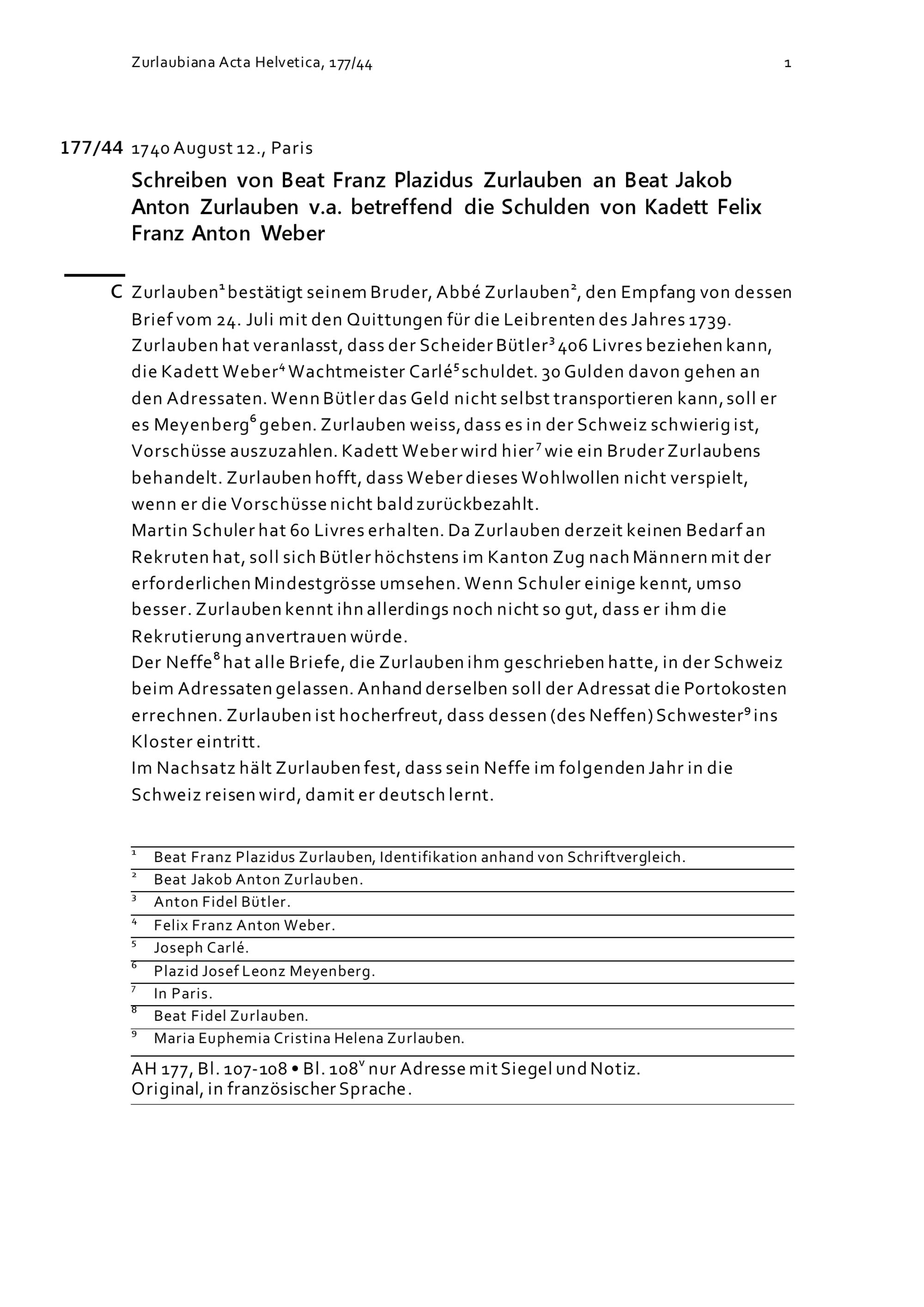 Schreiben von Beat Franz Plazidus Zurlauben an Beat Jakob Anton Zurlauben v.a. betreffend...