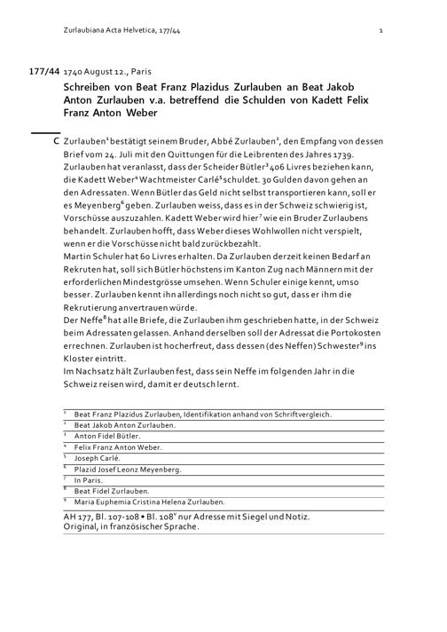 Schreiben von Beat Franz Plazidus Zurlauben an Beat Jakob Anton Zurlauben v.a. betreffend die Schulden von Kadett Felix Franz Anton Weber