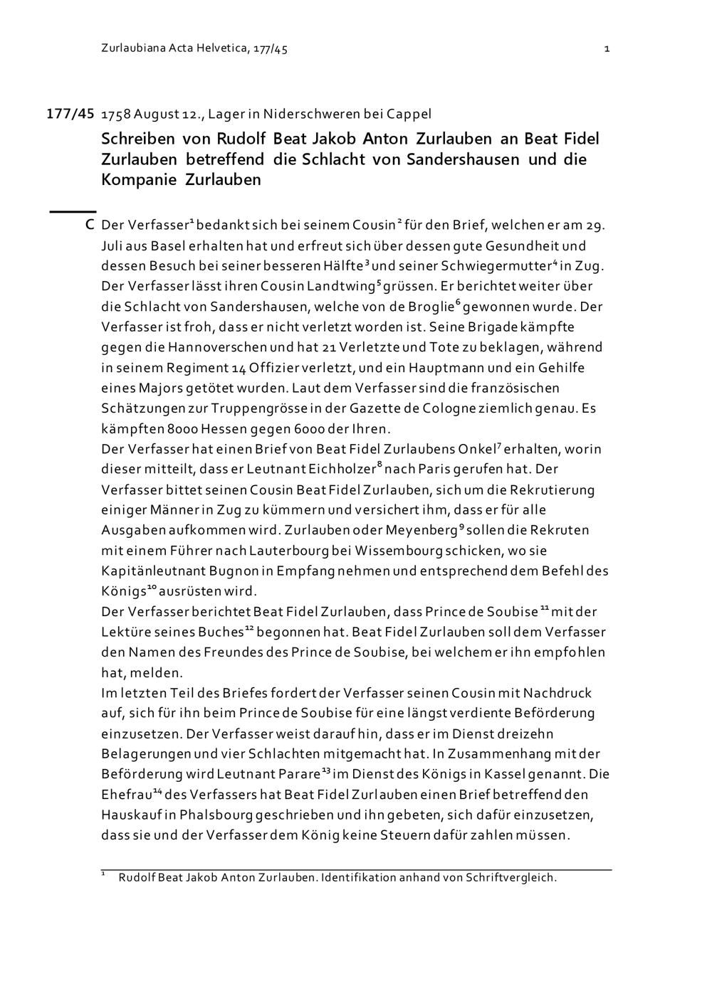 Schreiben von Rudolf Beat Jakob Anton Zurlauben an Beat Fidel Zurlauben betreffend die Schlacht von Sandershausen und die Kompanie Zurlauben