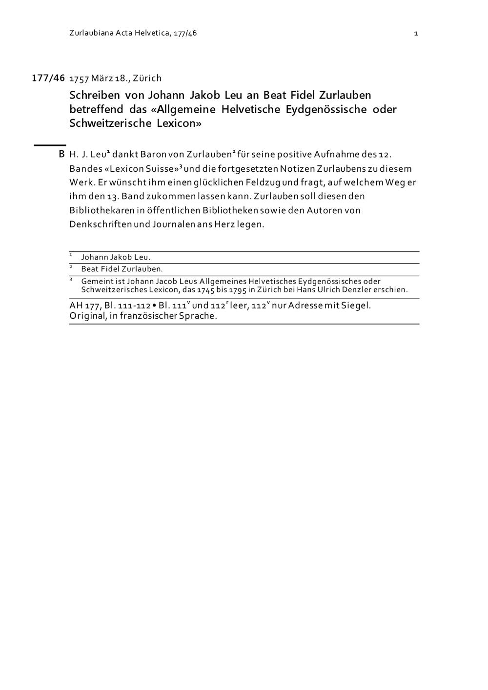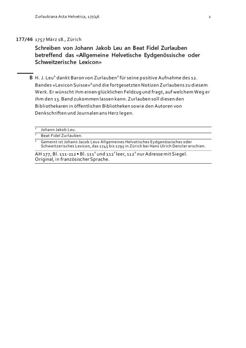 Schreiben von Johann Jakob Leu an Beat Fidel Zurlauben betreffend das «Allgemeine Helvetische Eydgenössische oder Schweitzerische Lexicon»