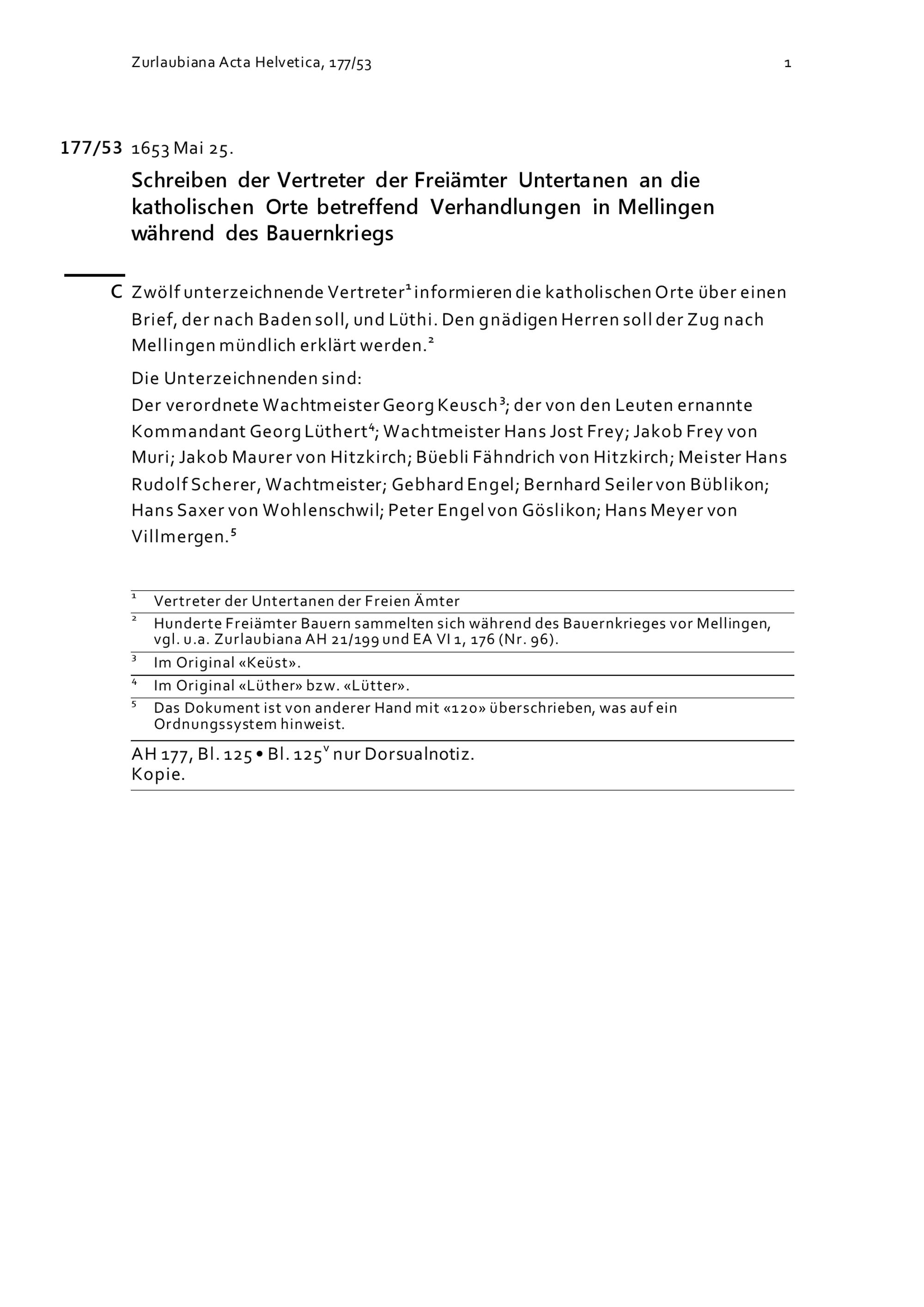 Schreiben der Vertreter der Freiämter Untertanen an die Katholischen Orte betreffend Verhandlungen in Mellingen während des Bauernkriegs