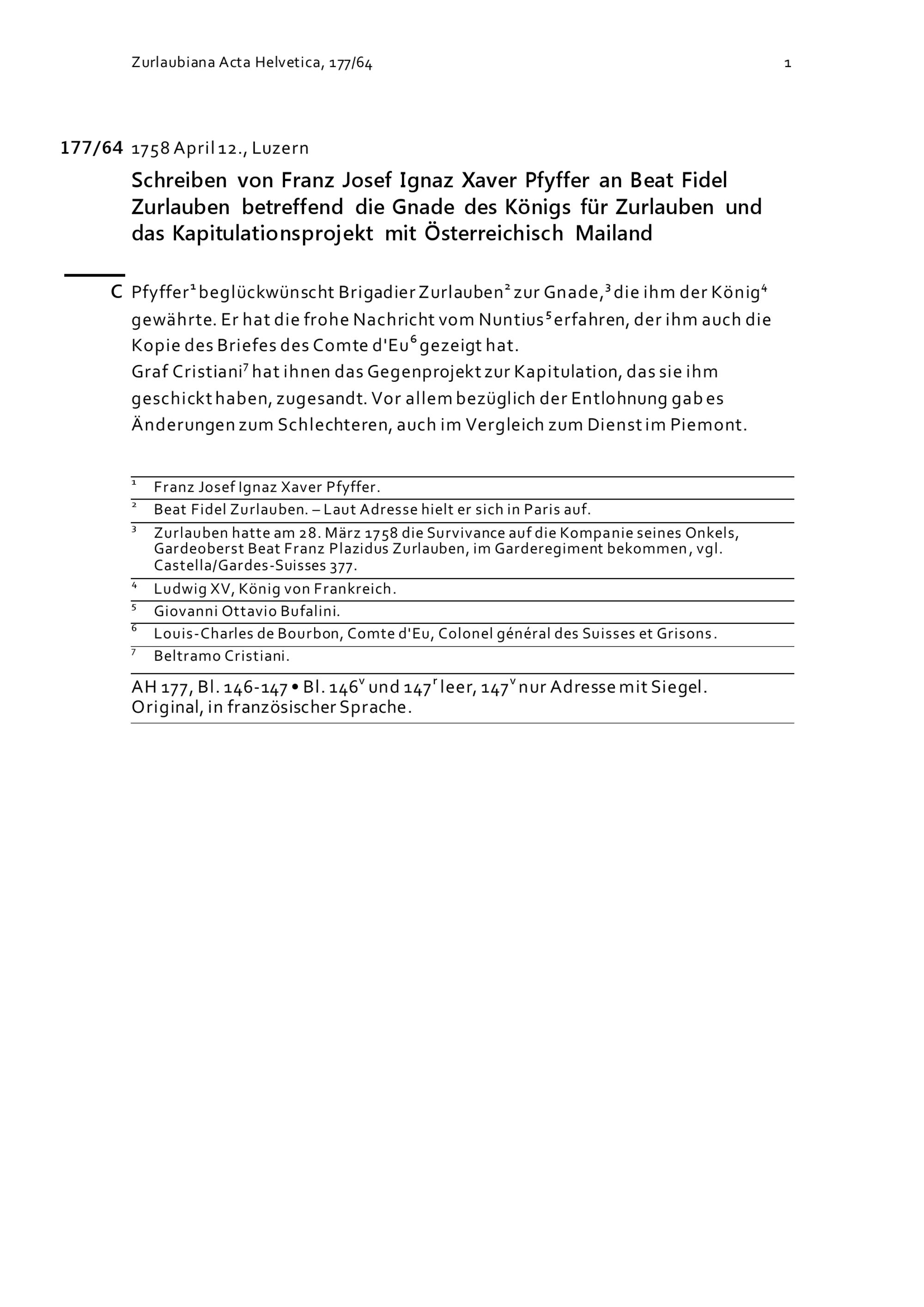 Schreiben von Franz Josef Ignaz Xaver Pfyffer an Beat Fidel Zurlauben betreffend die Gnade des Königs für Zurlauben und das Kapitulationsprojekt mit österreichisch Mailand