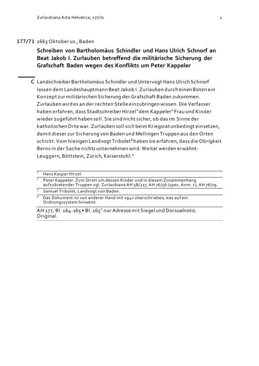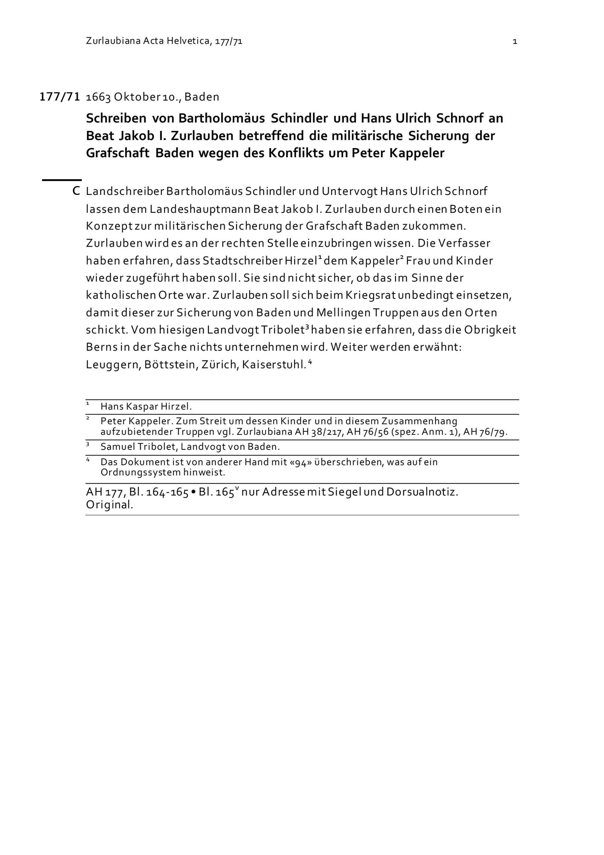 Schreiben von Bartholomäus Schindler und Hans Ulrich Schnorf an Beat Jakob I. Zurlauben betreffend die militärische Sicherung der Grafschaft Baden wegen des Konflikts um Peter Kappeler