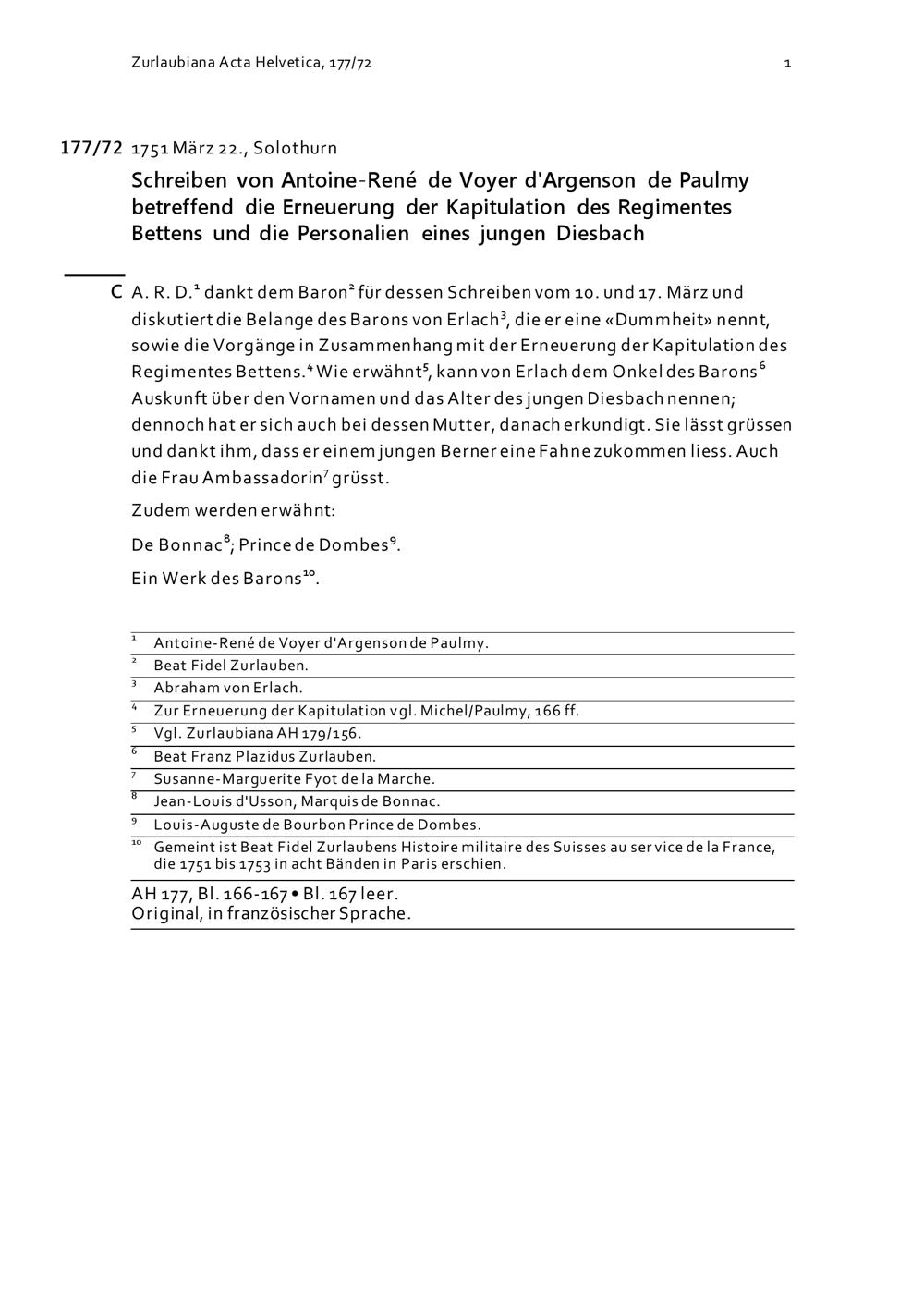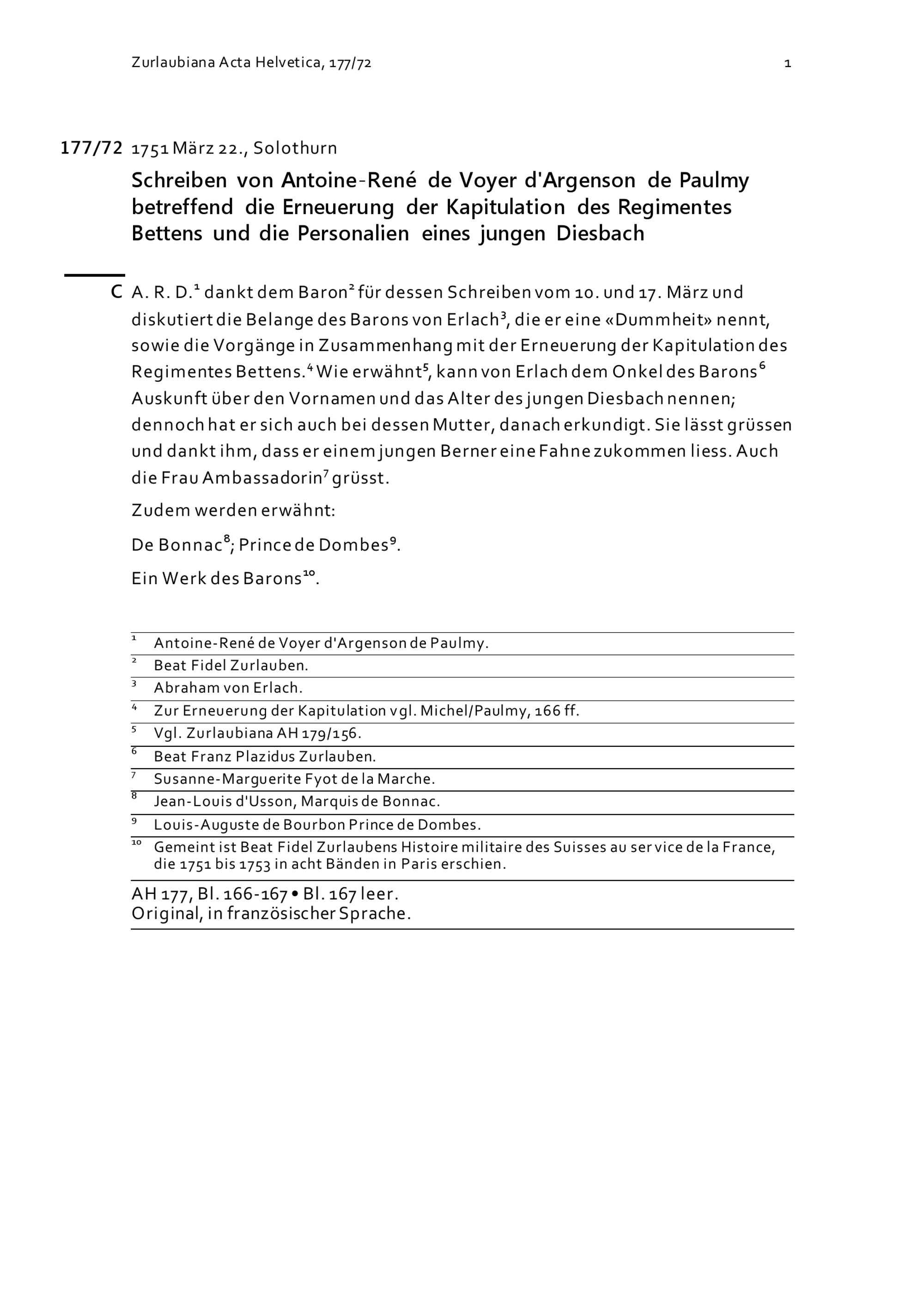 Schreiben von Antoine-René de Voyer d'Argenson de Paulmy betreffend die Erneuerung der Kapitulation des Regiments Bettens und die Personalien eines jungen Diesbach
