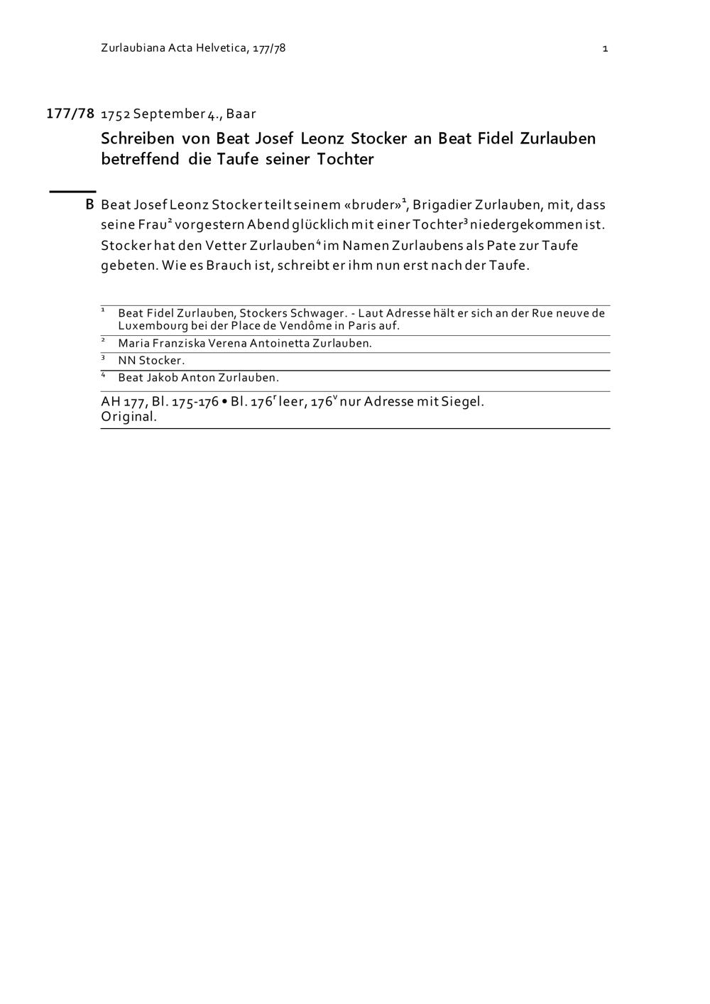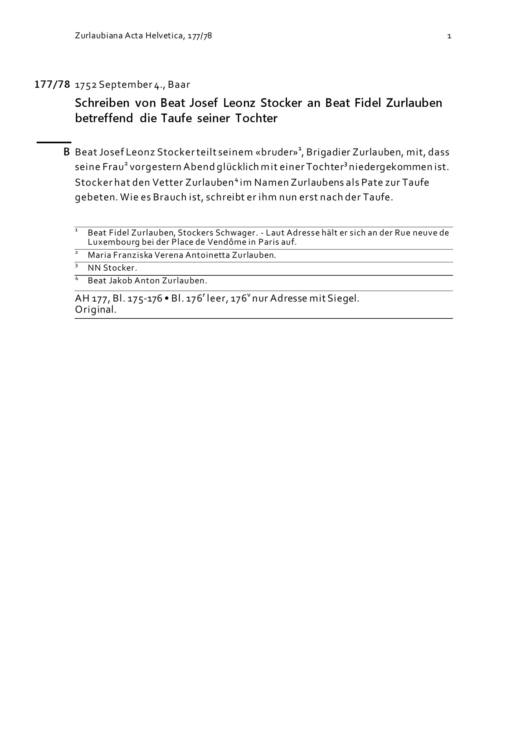 Schreiben von Beat Josef Leonz Stocker an Beat Fidel Zurlauben betreffend die Taufe seiner Tochter