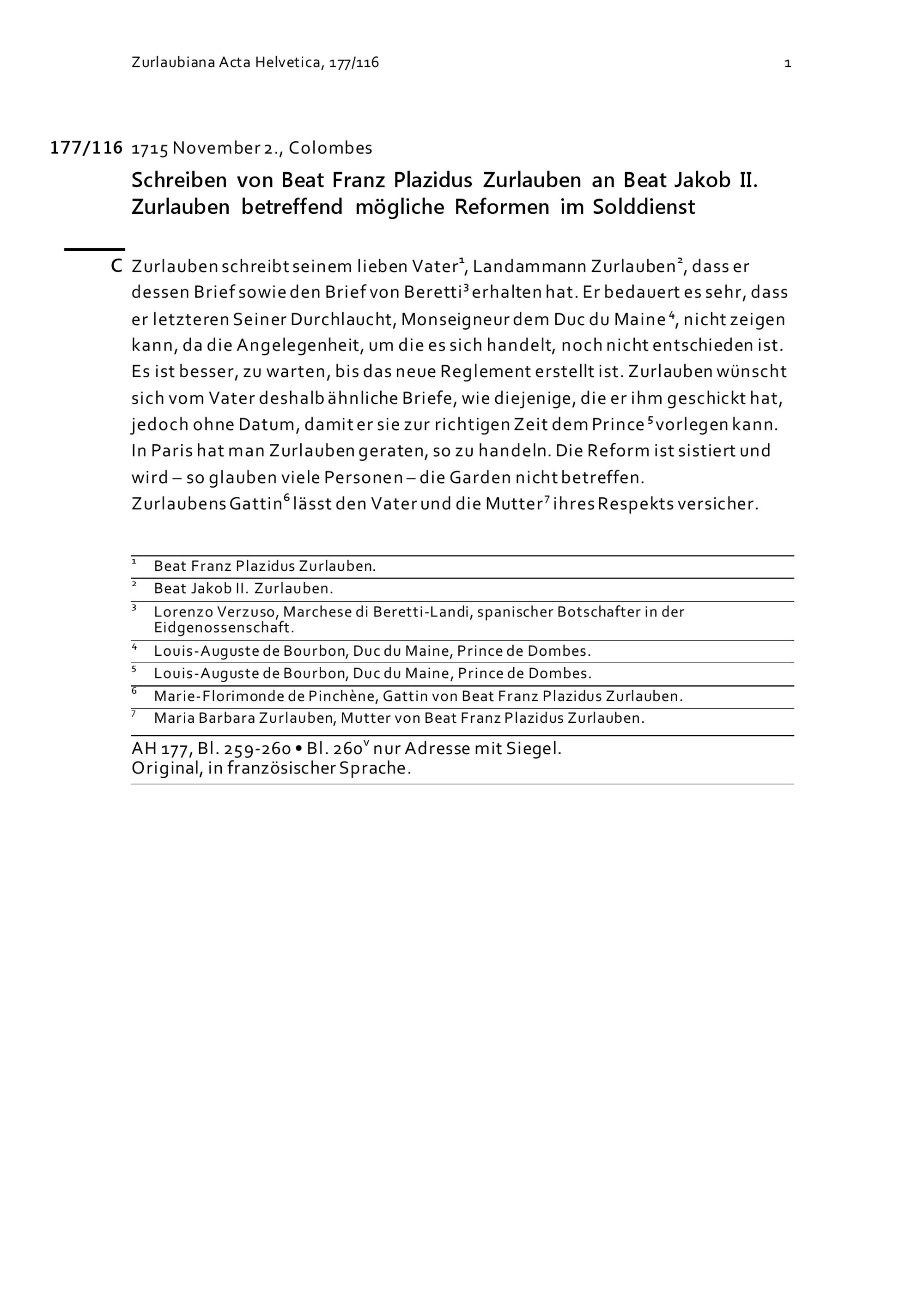 Schreiben von Beat Franz Plazidus Zurlauben an Beat Jakob II. Zurlauben betreffend mögliche Reformen im Solddienst