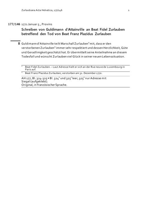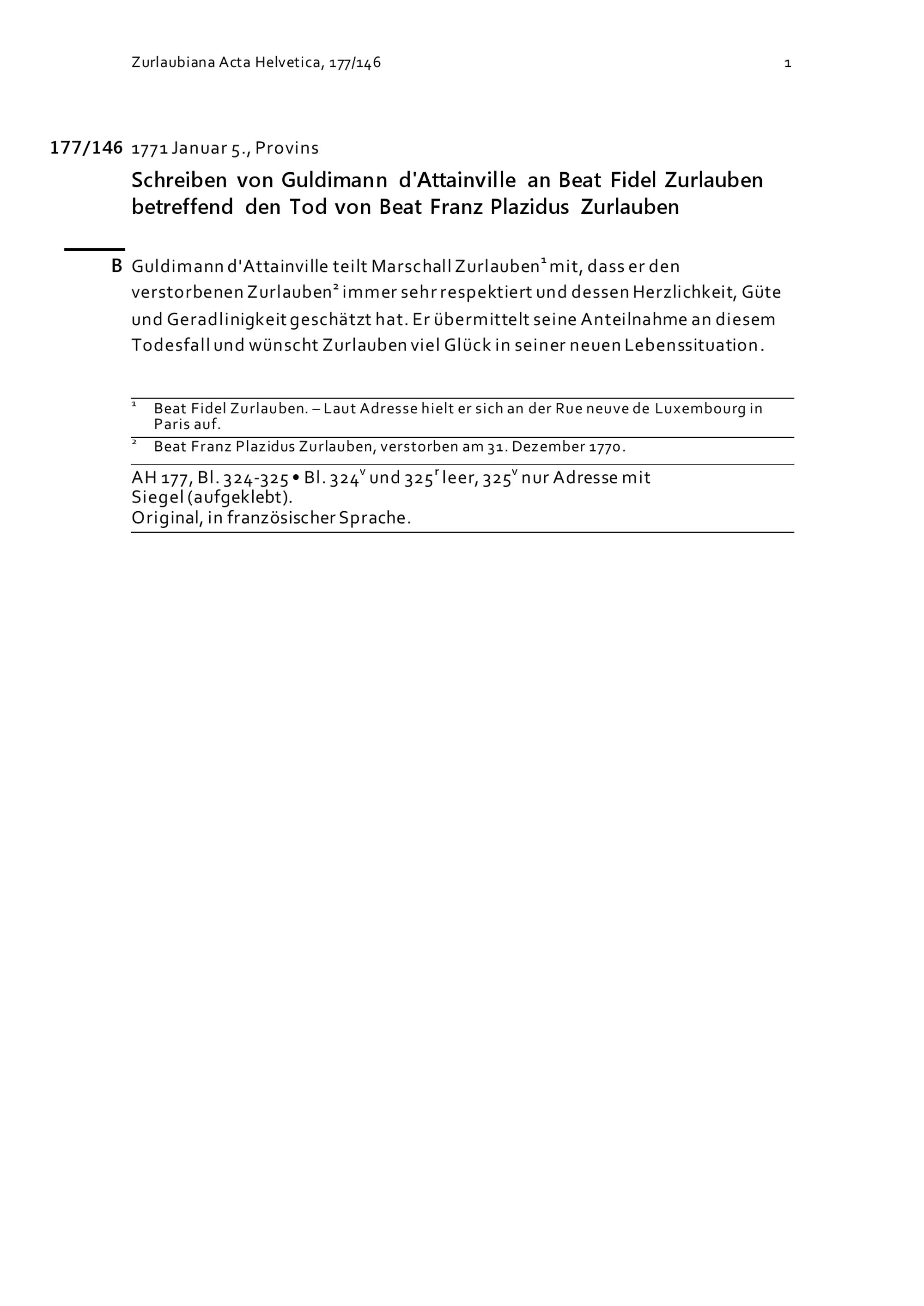 Schreiben von Guldimann d'Attainville an Beat Fidel Zurlauben betreffend den Tod von Beat Franz Plazidus Zurlauben
