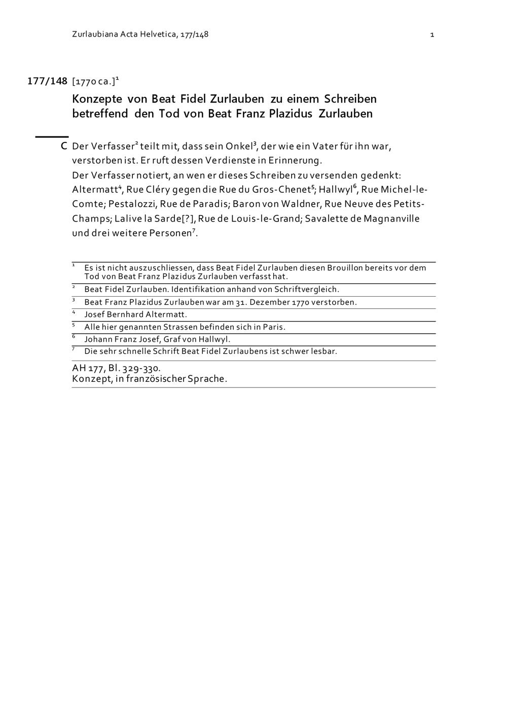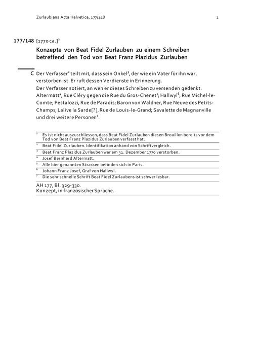 Konzepte von Beat Fidel Zurlauben zu einem Schreiben betreffend den Tod von Beat Franz Plazidus Zurlauben