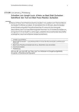 Schreiben von Joseph-Louis d'Heiss an Beat Fidel Zurlauben betreffend den Tod von Beat Franz Plazidus Zurlauben