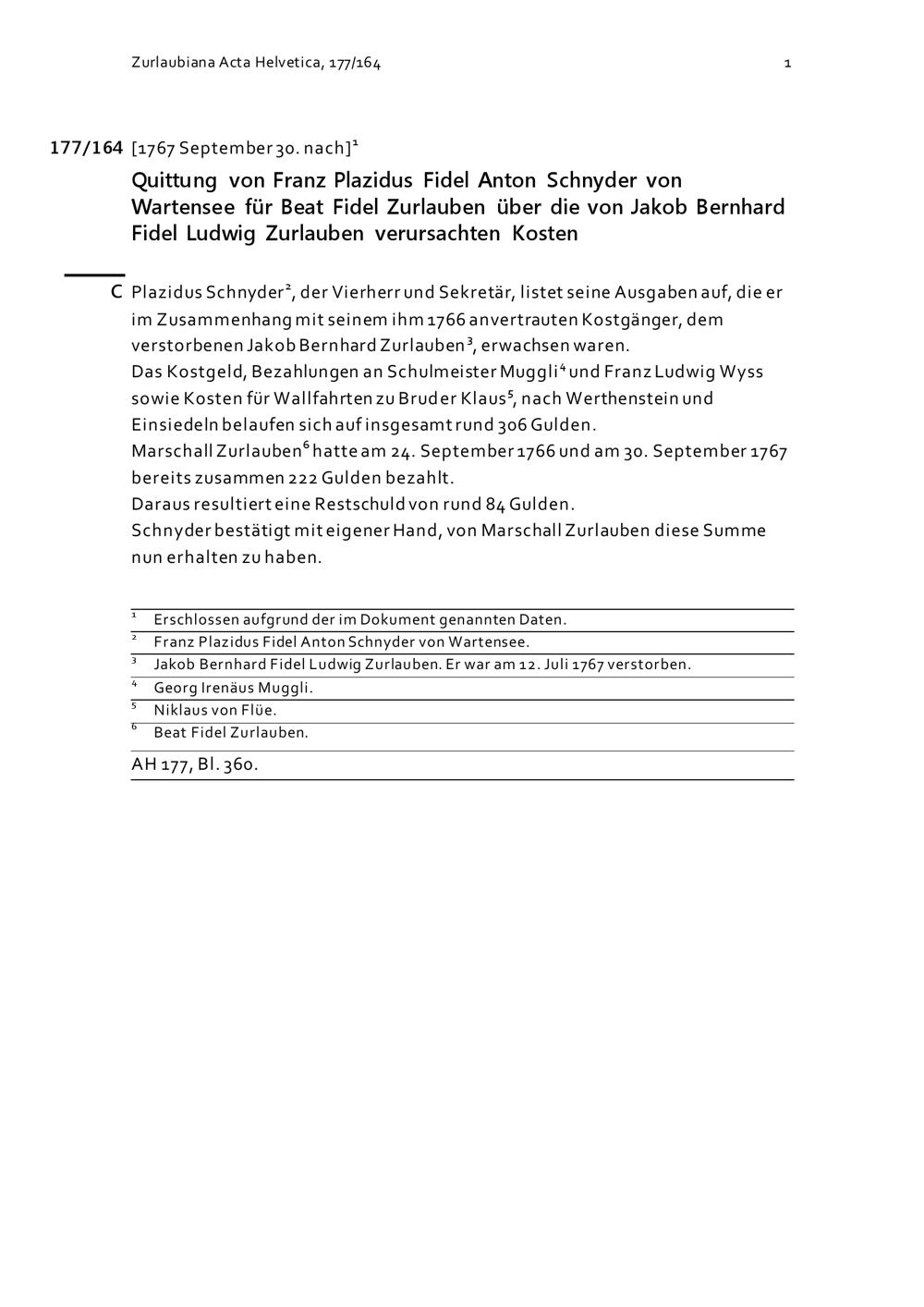 Quittung von Franz Plazidus Fidel Anton Schnyder von Wartensee für Beat Fidel Zurlauben über die von Jakob Bernhard Fidel Ludwig Zurlauben verursachten Kosten