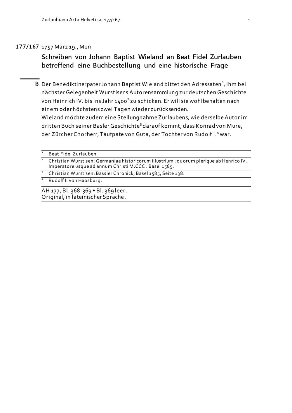Schreiben von Johann Baptist Wieland an Beat Fidel Zurlauben betreffend eine Buchbestellung und eine historische Frage