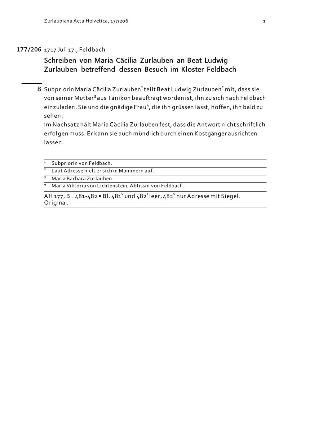 Schreiben von Maria Cäcilia Zurlauben an Beat Ludwig Zurlauben betreffend dessen Besuch im Kloster Feldbach