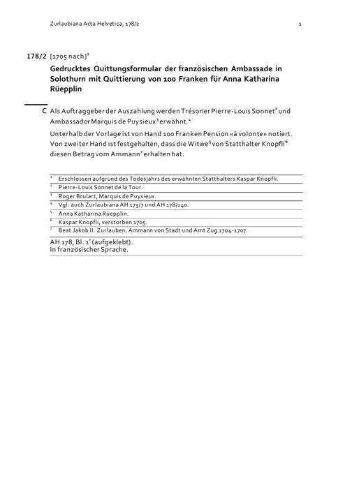 Druck: Quittungsformular der französischen Ambassade in Solothurn mit Quittierung von 100 Franken für Anna Katharina Rüepplin