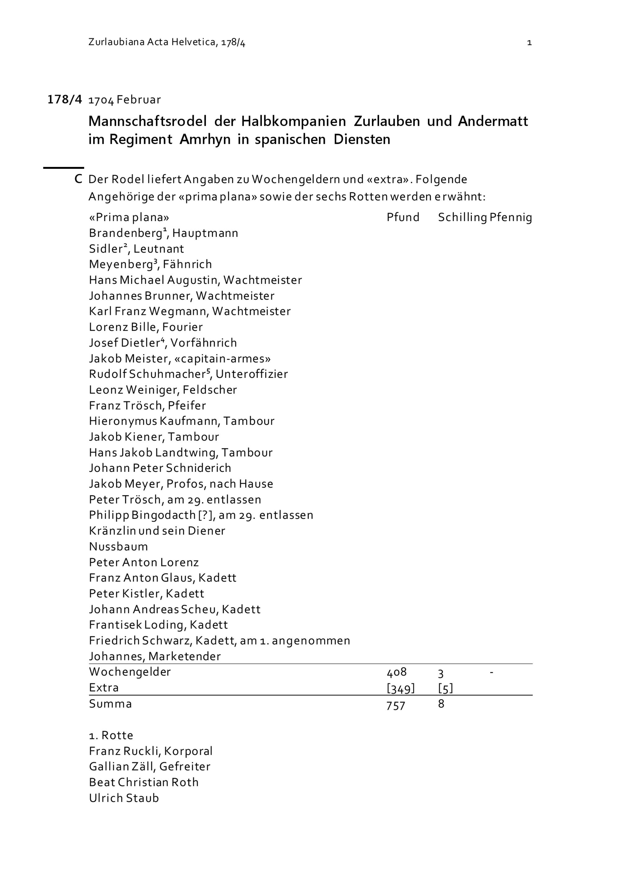 Mannschaftsrodel der Halbkompanien Zurlauben und Andermatt im Regiment Amrhyn in spanischen Diensten