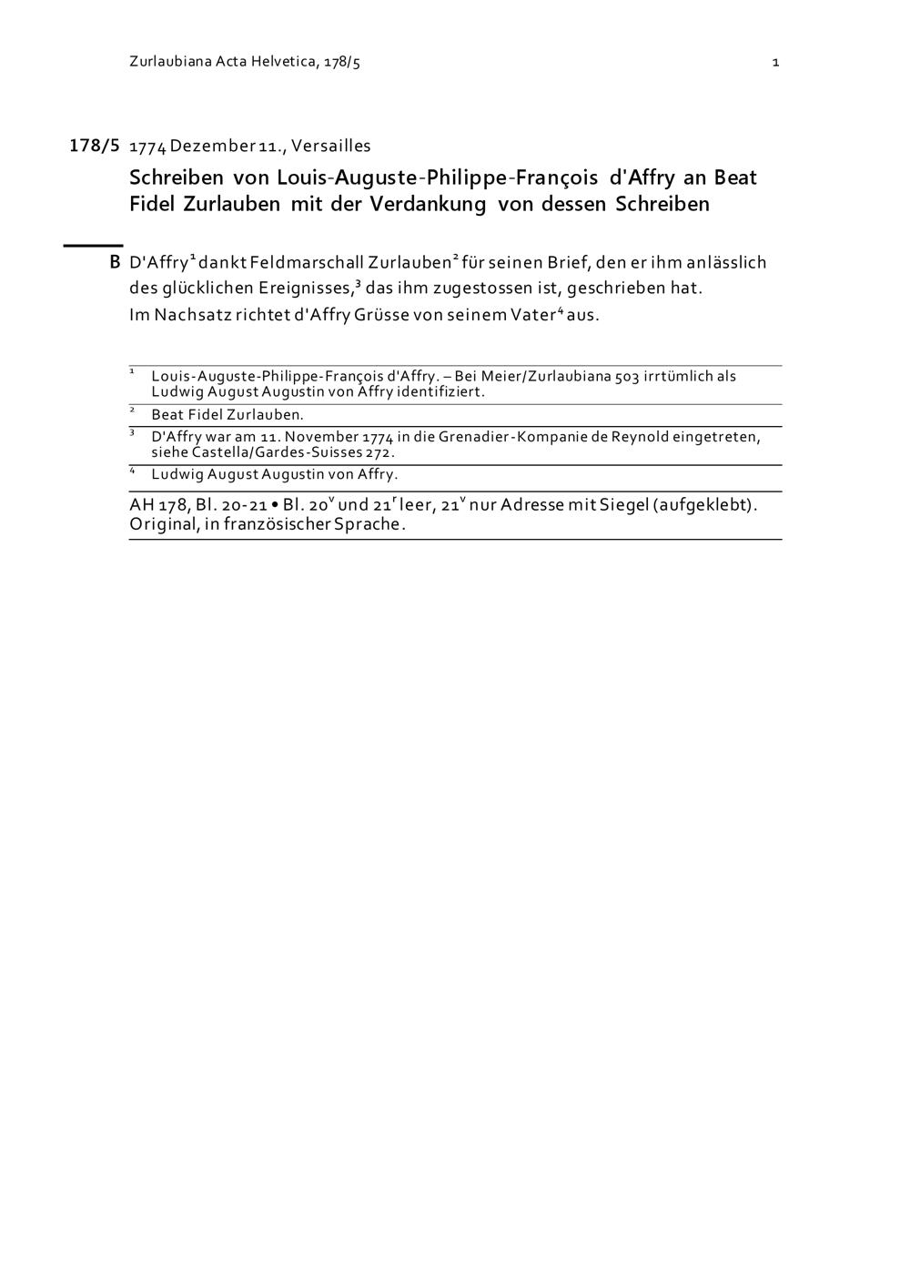 Schreiben von Louis-Auguste-Philippe-François d'Affry an Beat Fidel Zurlauben mit...