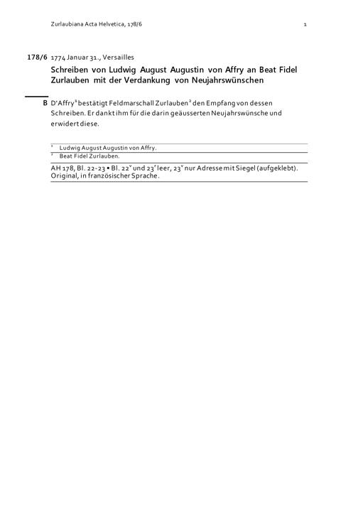 Schreiben von Ludwig August Augustin von Affry an Beat Fidel Zurlauben mit der Verdankung von Neujahrswünschen