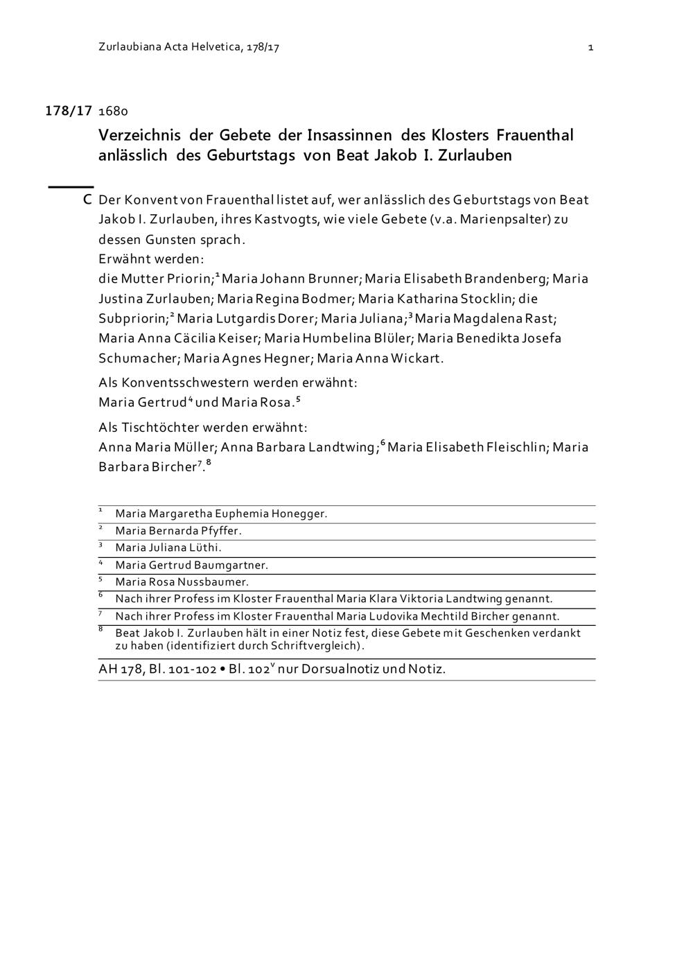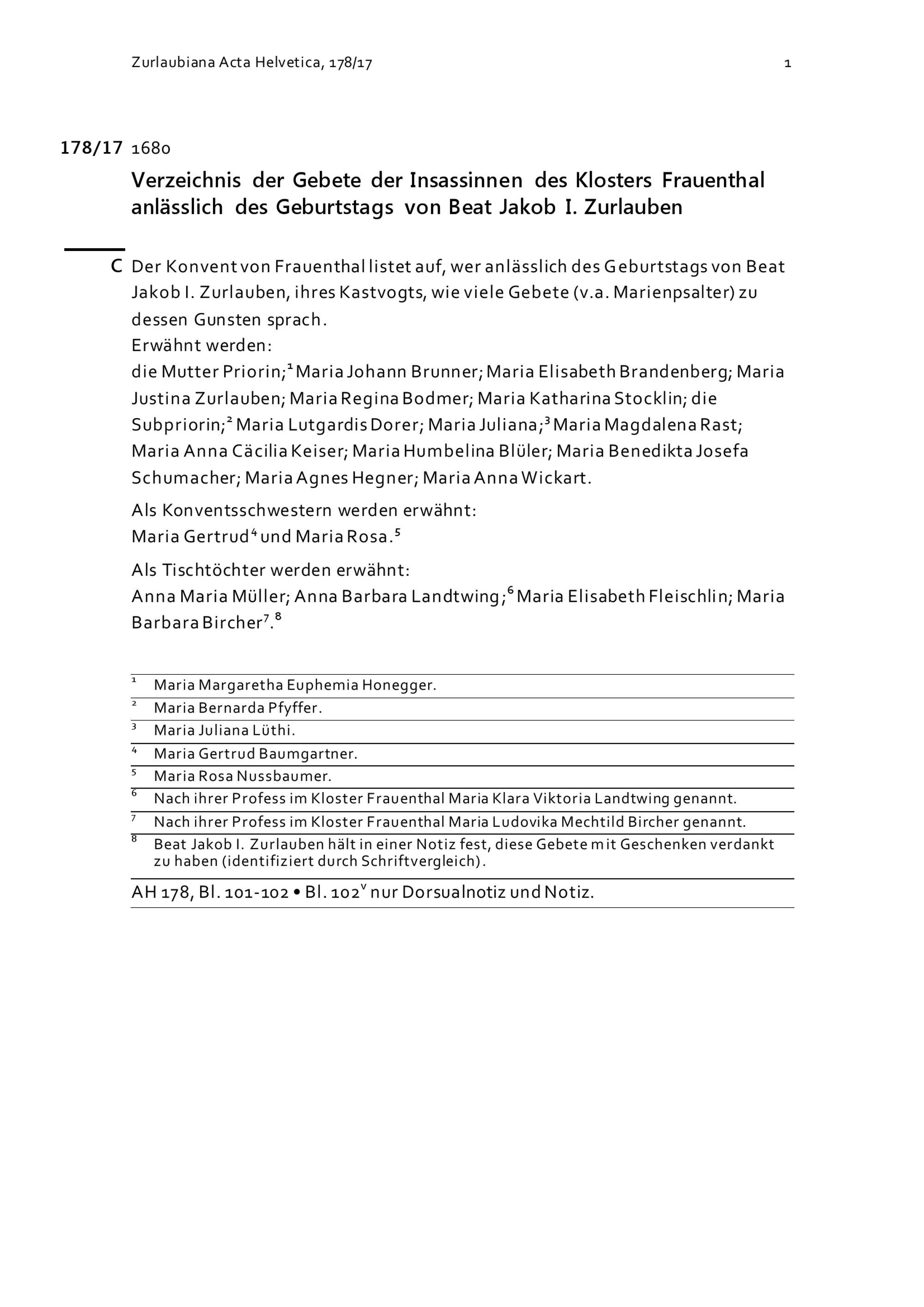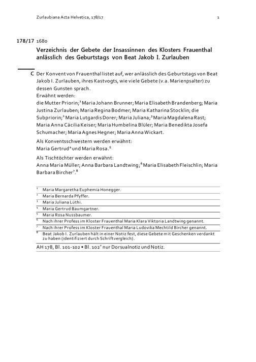 Verzeichnis der Gebete der Insassinnen des Frauenklosters Frauenthal anlässlich des Geburtstags von Beat Jakob I. Zurlauben