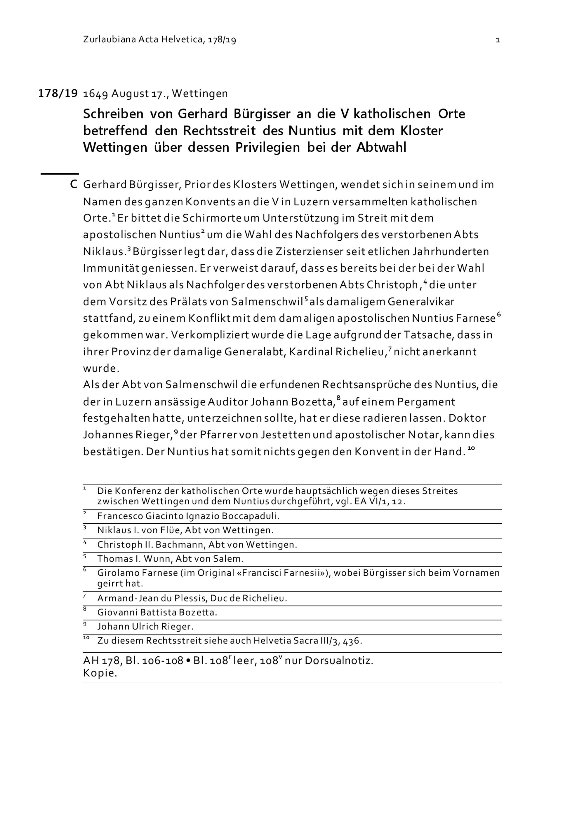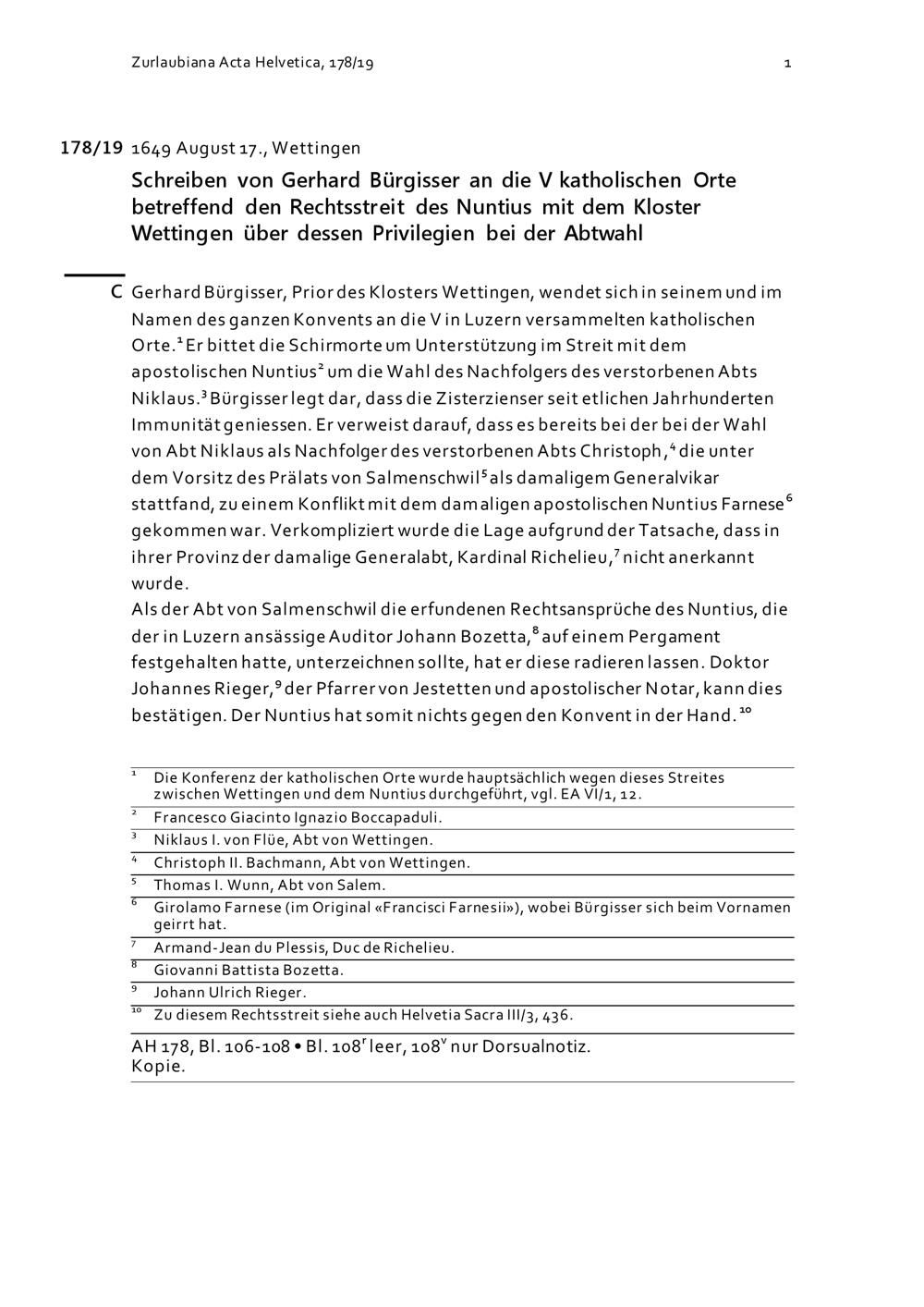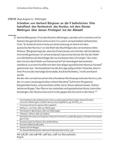 Schreiben von Gerhard Bürgisser an die Fünf Katholischen Orte betreffend den Rechtsstreit des Nuntius mit dem Kloster Wettingen über dessen Privilegien bei der Abtwahl